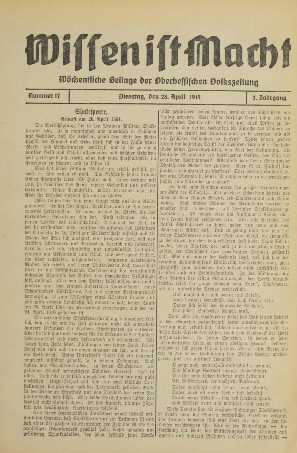 Dann aber hat Shakespeare selbst das Leid seines Lebens in den Sonetten ausgeströmt, deren autobiographische Be— deutung man erkant hat, seitdem man aufhörte, sie als be— stellte kalte Spiele des Witzes(nach dem Geschmack der Zeit) mißzuverstehen. In diesen Sonetten, in denen er seine leidenschaftliche Liebe zu einem adeligen Freund bekennt, empört er sich gegen seinen sozialen Beruf. Die Verse, die wir in der neuen Umdichtung von Stefan George wieder— geben, sind ein gültiges Zeugnis: