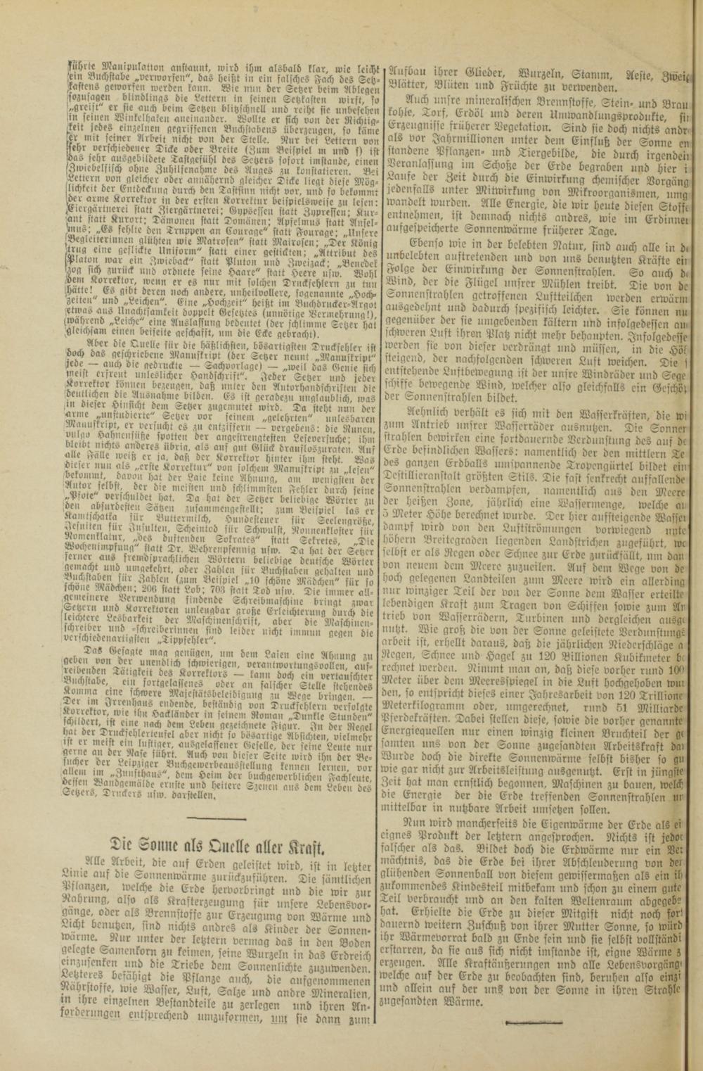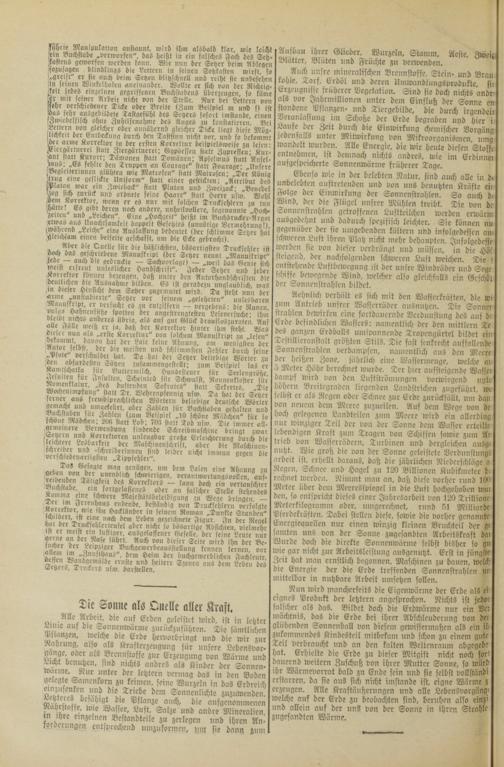 Nun wird mancherseits die Eigenwärme der Erde al eignes Produkt der letztern angesprochen. Nichts ist 1 falscher als das. Bildet doch die Erdwärme nur ein mächtnis, das die Erde bei ihrer Abschleuderung von glühenden Sonnenball von diesem gewissermaßen als zukommendes Kindesteil mitbekam und schon zu eine Teil verbraucht und an den kalten Weltenraum ab. hat. Erhielte die Erde zu dieser Mitgift nicht noch dauernd weitern Zuschuß von ihrer Mutter Sonne, so u ihr Wärmevorrat bald zu Ende sein und sie selbst vollst erstarren, da sie aus sich nicht imstande ist, eigne Wärm erzeugen. Alle Kraftäußerungen und alle Lebensvorge welche auf der Erde zu beobachten sind, beruhen als 0 und allein auf der uns von der Sonne in ihren St zugesandten Wärme. 5