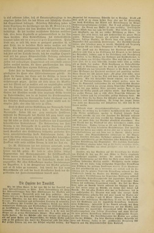 Der Zweck und die Bedeutung des Wanderns erblickt man allerseits nicht bloß in der Kräftigung des Körpers, in der Hebung der Gesundheit, sondern auch in der Erfrischung und Bereicherung des Geistes, in der Weckung von Ausdauer und Entschlossenheit, in der Erziehung zum sittlichen Charakter. Man muß sich aber von der fixen Idee, die so viele beherrscht, draußen besser leben zu müssen als zu Hause, frei machen. Diese Gewöhnung an Anspruchslosig⸗ keit muß in Verbindung mit der durch sie geförderten Ausdauer und Zähigkeit als das bedeutende Moment in der Reihe der erzieh⸗ lichen Wirkungen des Wanderns anerkannt und gewürdigt werden. Wenn Seume vor 100 Jahren sagte:„Es gänge alles besser, wenn man mehr gänge“, so hat der Satz auch heute noch seine vollste Be⸗ rechtigung. Wie viel Gesundheit könnte erhalten, wie viele Mil- lionen an Nationalvermögen könnten erspart werden, wenn der Sinn für Gymnastik, insbesondere für ein frischfröhliches Wander⸗ leben, das so ziemlich der einzige Zweig körperlicher Beschäftigung ist, der bis zum höchsten Alter getrieben werden kann, in den Massen des Volkes geweckt und erhalten würde. Das Wandern hat den großen Vorzug, daß es nicht allein körperliche Uebungen im Freien, sondern auch die erfreulichste, geistige Nahrung bietet. Es weckt den Sinn für die Natur, die Fähigkeit und die Lust zur Be⸗ obachtung und Naturbeobachtung. Es bringt den jungen Leuten eine Fülle von Kenntnissen und Fähigkeiten bei, ohne daß sie ein Lernen merken.