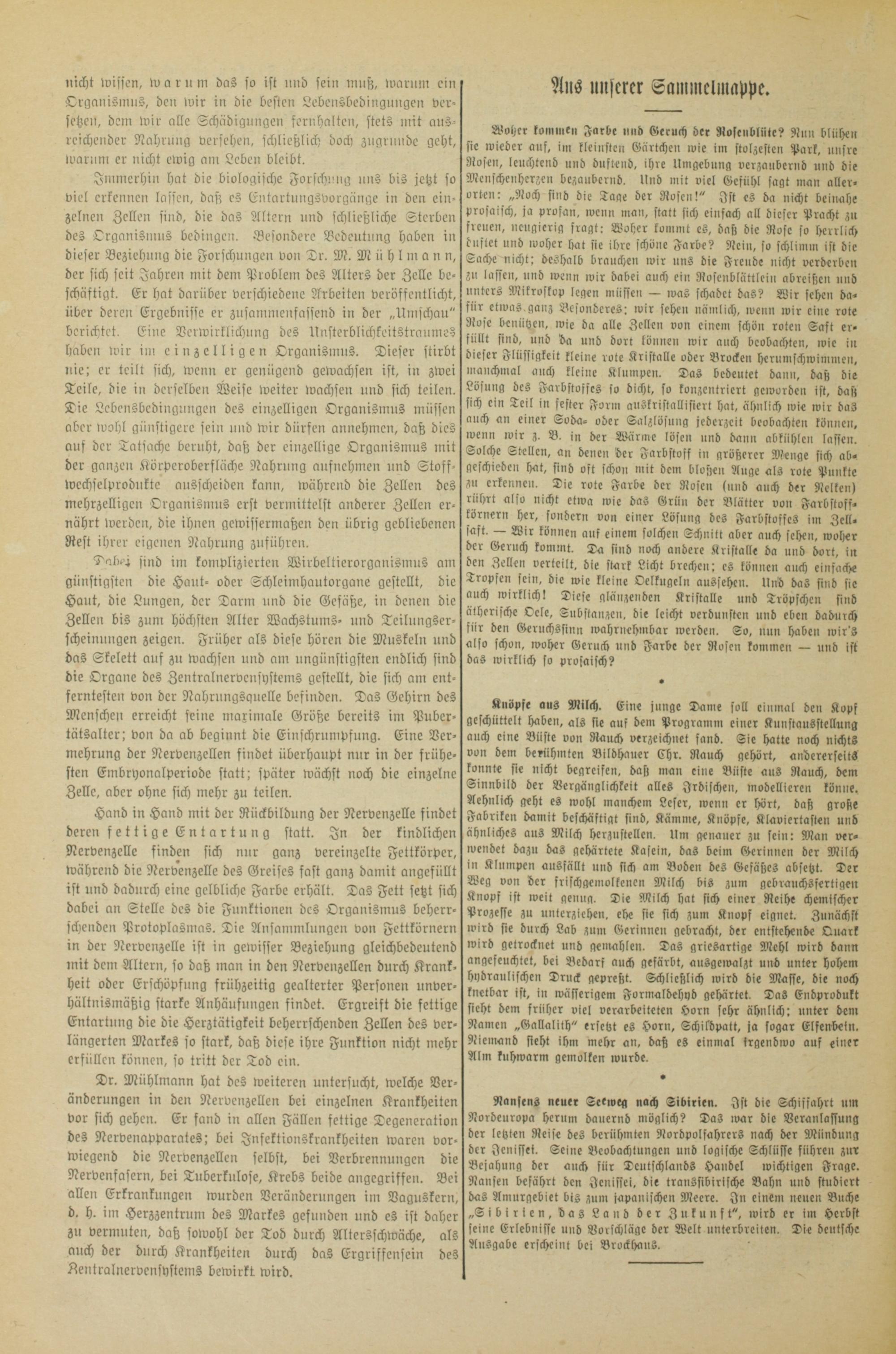 Immerhin hat die biologische Forschung uns bis jetzt so viel erkennen lassen, daß es Entartungsvorgänge in den ein— zelnen Zellen sind, die das Altern und schließliche Sterben des Organismus bedingen. Besondere Bedeutung haben in dieser Beziehung die Forschungen von Dr. M. Mühlmann, der sich seit Jahren mit dem Problem des Alters der Zelle be— schäftigt. Er hat darüber verschiedene Arbeiten veröffentlicht, über deren Ergebnisse er zusammenfassend in der„Umschau“ berichtet. Eine Verwirklichung des Unsterblichkeitstraumes haben wir im einzelligen Organismus. Dieser stirbt nie; er teilt sich, wenn er genügend gewachsen ist, in zwei Teile, die in derselben Weise weiter wachsen und sich teilen. Die Lebensbedingungen des einzelligen Organismus müssen aber wohl günstigere sein und wir dürfen annehmen, daß dies auf der Tatsache beruht, daß der einzellige Organismus mit der ganzen Körperoberfläche Nahrung aufnehmen und Stoff— wechselprodukte ausscheiden kann, während die Zellen des mehrzelligen Organismus erst vermittelst anderer Zellen er— nährt werden, die ihnen gewissermaßen den übrig gebliebenen Rest ihrer eigenen Nahrung zuführen.