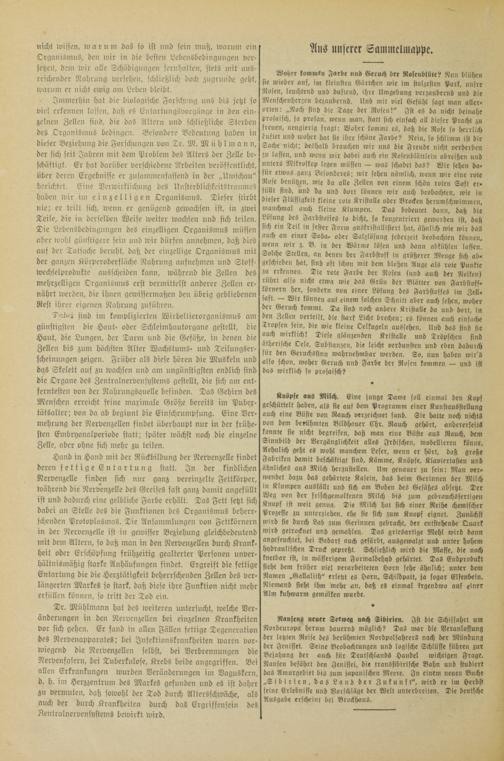 Hand in Hand mit der Rückbildung der Nervenzelle findet deren fettige Entartung statt. In der kindlichen Nervenzelle finden sich nur ganz vereinzelte Fettkörper, während die Nervenzelle des Greises fast ganz damit angefüllt ist und dadurch eine gelbliche Farbe erhält. Das Fett setzt sich dabei an Stelle des die Funktionen des Organismus beherr— schenden Protoplasmas. Die Ansammlungen von Fettkörnern in der Nervenzelle ist in gewisser Beziehung gleichbedeutend mit dem Altern, so daß man in den Nervenzellen durch Krank— heit oder Erschöpfung frühzeitig gealterter Personen unver⸗ hältnismäßig starke Anhäufungen findet. Ergreift die fettige Entartung die die Herztätigkeit beherrschenden Zellen des ver— längerten Markes so stark, daß diese ihre Funktion nicht mehr erfüllen können, so tritt der Tod ein.