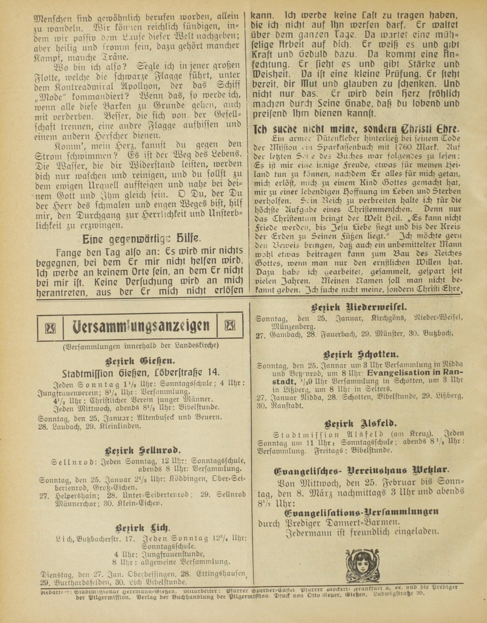 Sellnrod: Jeden Sonntag, 12 Uhr: Sonnlagsschule, abends 8 Uhr: Versammlung. Sonntag, den 25. Januar 2‘/a Uhr: Köddingen, Ober-Sei- berrenrod, Groß-Eichen.