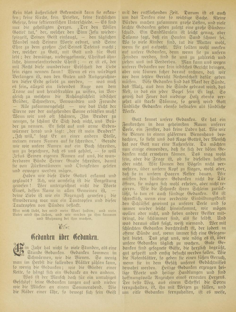 Gott keitiiet tinsere Gedanke». Er hat ein Fensterchen in dem geheimsten Raum titiserer Seele, ein Fenster, das keine Laden hat. Wie ivir die Bienen iu einem gläsernen Bienenhaus beobachten, so sieht uns das Auge Gottes, der Mensch hat vor Gott nur eilte Außenseite. Da möchten nun einige einivendeit, daß sie sich der bösen Gedanken iticht erivehren können. Das »tag ivohl sein, aber die Frage ist, ob sie dieselben hassen oder nicht. Wir könne» den Vögelit nicht vermehren, über unser» Kopf 311 fliegen, wohl aber, daß sie iit unfern Haaren Nester bauen. Wir müssen den sündigen Gedankeit iticht die Tür öffnen, sie mögen sich ivohl erhebeit, aber nicht regieren. Wie die Schnecke ihren Schlei», zurückläßt, so tun es auch sündige Gedanken. Es ist schrecklich, wenn eine verderbte Einbildungskraft den Schlüssel geiviitnt zu tmserer Seele und so imnter wieder leicht hineinkommt, wir mögen wollen oder nicht, tind siebeit andere Geister mit- bringt, die schlimmer siitd, als sie selbst. Unb was daraus alles folgt, weiß niemand. Wer mit schlechten Gedanken durchtränkt ist, der lodert m offene Sünde auf, iveitit immer sich eine Gelegenheit bietet. Das zeigt uns, wie nötig es ist, über unsere Gedanken täglich zu ivacheit. Gute Gedankeit siitd gesegitete Gäste, die herzlich begrüßt, gilt gespeist ttitd emsig besucht werden sollen. Wie die Rosenblätter, so geben sie eilten süßen Geruch, weitit sie in dent Gefäß unseres Gedächtnisses bewahrt iverdeit. Heilige Gedankeit erzeugen heilige Worte und heilige Handlungen und sind hoffnungsvolle Anzeichen eines erneuten Herzens. Der beste Weg, aus eineiit Scheffel die Sprett fernzuhalten, ist, ihn mit Wcizeit gu füllen, und um eitle Gedanken fernzuhalten, ist es weise,
