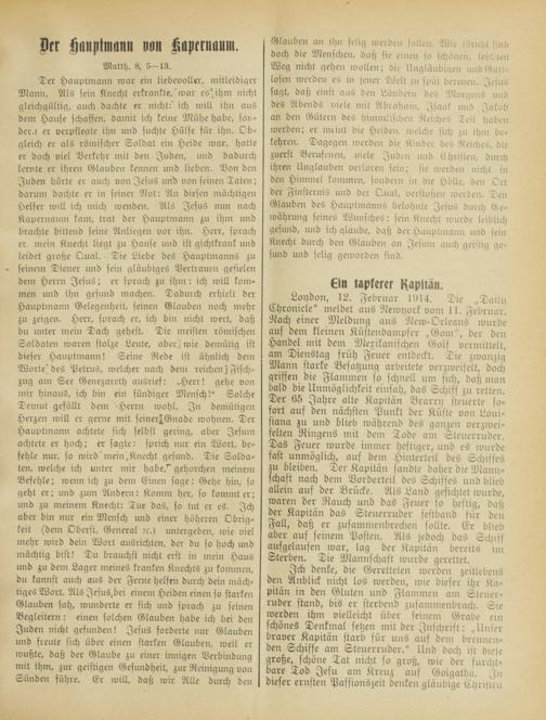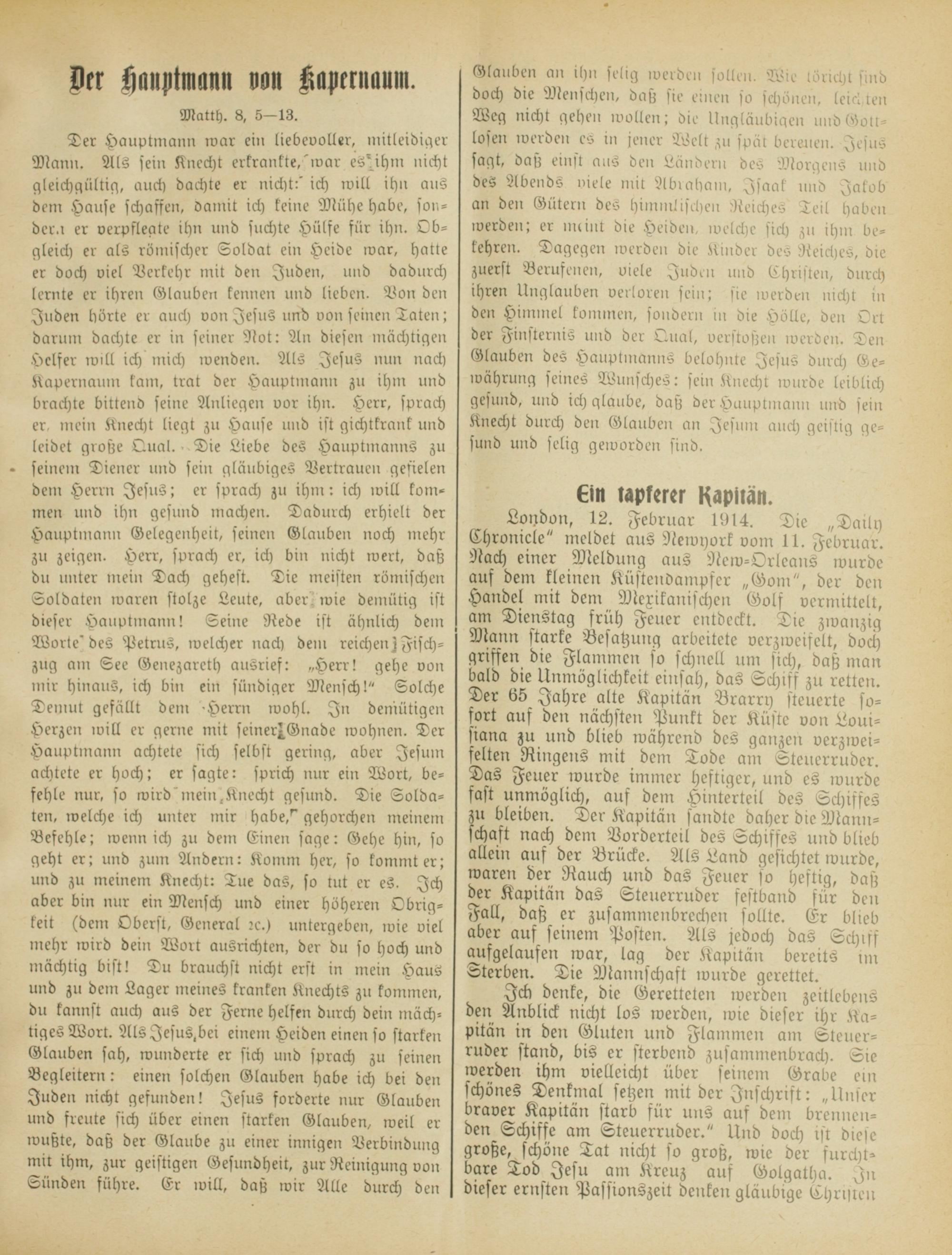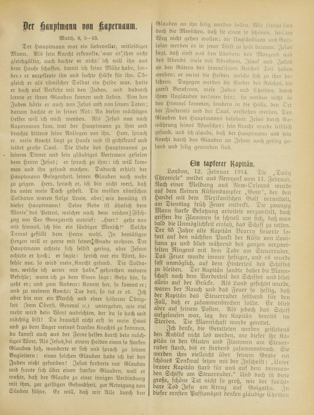 Ter Hauptmann war ein liebevoller, mitleidiger Mann. Als sein Knecht erkrankte,'war esJhm nicht gleichgültig, auch dachte er nicht:' ich will ihn aus dem Hause schaffen, damit ich keine Mühe habe, sondern er verpflegte ihn und suchte Hülfe für ihn. Obgleich er als römischer Soldat ein Heide war, hatte er doch viel Verkehr mit den Juden, und dadurch lernte er ihren Glauben kennen und lieben. Von den Juden hörte er auch von Jesus und von seinen Taten; darum dachte er in seiner Rot: An diesen mächtigen Helfer will ich mich wenden. Als Jesus nun nach Kapernaum kam, trat der Hauptmann zu ihm und brachte bittend seine Anliegen vor ihn. Herr, sprach er, mein Knecht liegt zu Hause u»d ist gichtkrauk und leidet grobe Qual.--Die Liebe des Hauptmanns zu seinem Diener und sein gläubiges Vertrauen gefielen dem Herrn Jesus; er sprach zu ihm: ich ivill kommen und ihn gesund machen. Dadurch erhielt der Hauptmann Gelegenheit, seinen Glauben noch mehr zu zeigen. Herr, sprach er. ich bin nicht wert, daß du unter mein Dach gehest. Die meisten römischen Soldaten waren stolze Leute, aber wie demütig ist dieser Hauptmann! Seine Rede ist ähnlich dem Worte'des Petrus, welcher nach dem reichenjFisch- zug ain See Genezareth ausrief: „Herr! gehe von