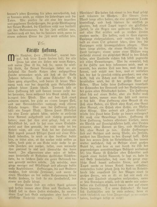 Menschen! Sie habeil sich etivas in den Kops gesetzt uild träumeil im Wachen. Sic können ihren Muild lange offen halten, ehe eine gebratene Taube hineinfliegt, uild doch scheiilen sie ivirklich zu glauben, daß eines Tages irgend ein glücklicher Zufall, so ein Regen voll goldenen Acpfelil, sie aus aller Not erlösen und zu reichen Leliten machen werde. Sic hoffeil, noch in ihrer eigcncil Equipage ciilherzufahren, und werden sich doch bald an einen Ort gebannt sehen, über beit die Equipagen nicht hiilwegzufahren pflegen. Man kann lange pfeifen, ehe einem Goldfische in die Hand springen; einem unter einer Million mag vielleicht eiilinal ein plötzliches Glück in den Schoß fallen, aber Tausende richteil sich selbst zugrunde mit eitlen Erwartnngeil. Wer da erivartet, daß er die Hälfte von dem bekommen wird, was er erivirbt, den vierten Teil von dem, was ihm zn- kommt, und Ilichts von denl, was er verliehen hat, der hat so ziemlich richtig gerechnet; wer aber denkt, daß ein Schatz aus dem Monde auf ihn herabfallen ivird, der ist der größte Narr auf Erden. Man sollte seine Hoffilungcil innerhalb der Schranken der Verilnnft uild der Verheißuilgen des guten alten Bibclbnches halteil. Tie Hoffiluilg lehnt sich ans einen Anker, aber ein Ailker muß etwas habeil, ivorail man ihn hält liild ivoran er sich hält. Eine Hoffnung ohne Grund ist ein Faß ohne Boden, ein Pferd ohne Kopf, eine Gans ohne Rumpf, eiil Schuh ohne Sohle, ein Messer ohile Klinge. Wer anders als „Hans Einfalt" würde fein Haus beim Dache zu bauen ailfangen? Es nluß eine Grundlage haben. Hoffnung ist keine Hoffilnng, soildern offenbare Torheit, wenn eiil Mensch auf Unmöglichkeiten hofft, oder Ernten erwartet, ohne Samen zll säen, und Glückseligkeit, ohile Gutes zll tun. Solche Hoffnungen sind viel Geschrei llnv ivenig Wolle, eiil Irrlicht, welches den Wanderer in den Sumpf lockt. Seht hier deil armen Fritz im Arbeitshause, der immer wieder versichert, daß er Besitzer eines großen Gutes sei, axt§ dem er nur durch die List des gegenwärtigen unrechtmäßigen Besitzers verdrängt sei; sein Name ist Scheller oder Schendler und irgend einer dieses Namens, so sagt er, habe so viel Geld hinterlasseil, daß man die ganze englische Bank damit anfaufen könne, und eines Tages iverde er seinen Allteil davon erhalten; unterdessen sindet jedoch Fritz die Kost im Arbeits- Hanse sehr unpassend für den Mageil eiiles so großen Herrn, ivie er ist: er hat mir auch ein oder zwei Tausend abzugebeil versprocheil, wenn er sein Vernlögen erhält, uild ich werde mir unter- dessen eiil Luftschloß damit baueil oder auf einem Besen hinreiten. Ter arme Schlucker! Er baut sich Luftschlösser wie so viele ailderc; denil er ivird schließlich nur seine Fingernägel zll vcrinachen haben, sonstiges besitzt er nicht!