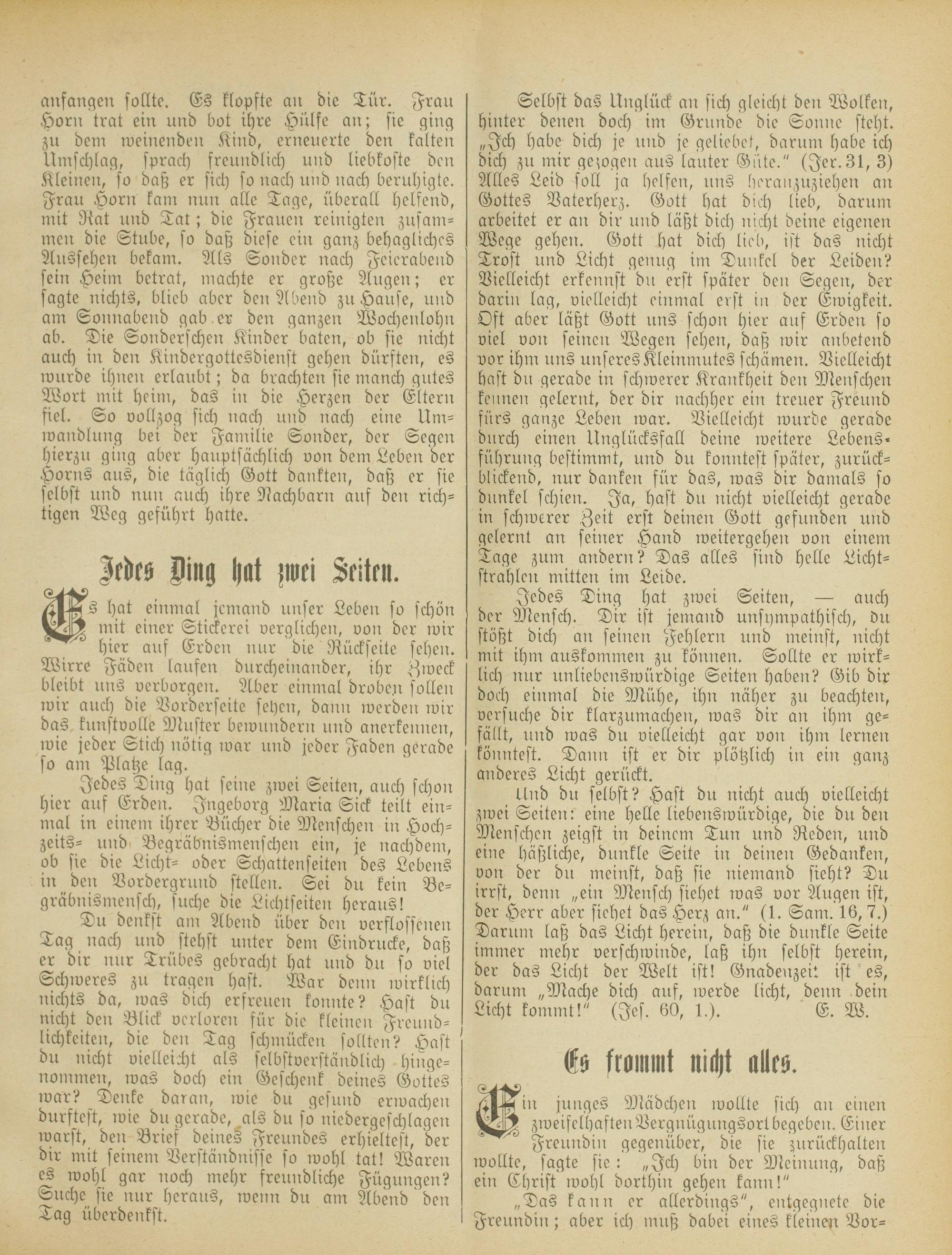 Hub du selbst? Hast du nicht auch vielleicht zwei Seiten: eine helle liebenswürdige, die du den Menschen zeigst in deinem Tun und Reden, und eine häßliche, dunkle Seite in deinen Gedanken, von der dn meinst, daß sie niemand sieht? Du irrst, denn „ein Mensch siehet was vor Augen ist, der Herr aber siehet das Herz an." (1. Sam. 16, 7.) Darum laß das Licht herein, daß die dunkle Seite immer mehr verschwinde, laß ihn selbst herein, der das Licht der Welt ist! Gnadenzeit ist es, darnni „Mache dich auf, werde licht, denn dein Licht kommt!" (Jes. 60, 1.). E. W.