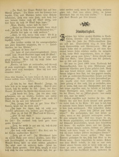 „„Fritz, gib es auf! Im Wirtshaus habe ich meine Ruhe und meinen Frieden, mein Ehe- und Famitienglück, ja meinen Gott verloren; im. Blauen Kreuz habe ich alles wieder gefundent Ja, alles was ich verloren halte. Jesus ha, meine Seele gerettet, lind Fritz, vergiß es nicht daß auch du eine unsterbtlche Seele hast, die ge