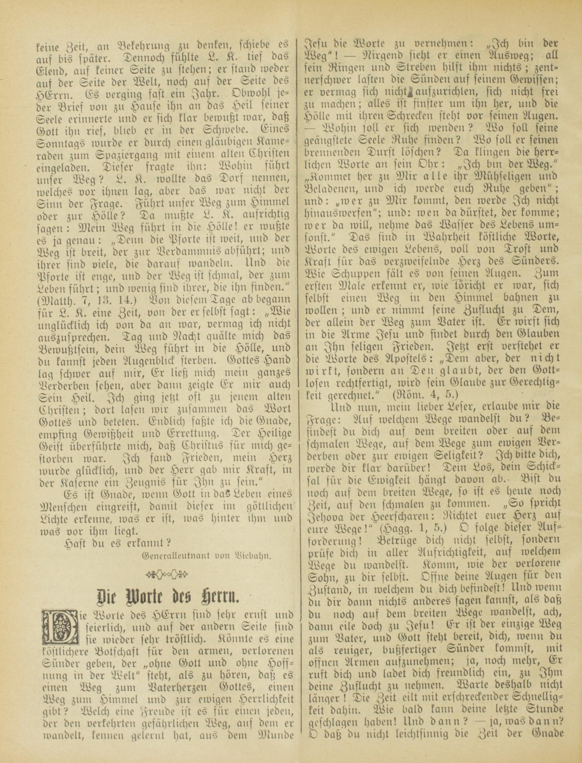 lind lillii, mein lieber Leser, erlaube mir die Frage: Alis welchem Wege lvandelst du? Be- sindest dll dich auf vem breiten oder auf den« schmalen Wege, auf dem Wege zum einigen Verderben oder zur einigen Seligkeit? Ich bitte dich, iverde dir klar darüber! Dein Los, dein Schicksal für die Eivigkeil hängt davon ab.- Bist du noch auf dem breiten Wege, so ist es heute noch Zeit, ans den schmalen zu kommen. „So spricht Jehova der Heerscharen: Richtet euer Herz ans eure Wege!" (Hagg. 1, 5.) O folge dieser Aufforderung ! Betrüge dich nicht selbst, sondern prüfe dich in aller Aufrichtigkeit, ans welchem Wege du ivandclst. Komm, ivie der verlorene Sohn, zu dir selbst. Offne deine Augen für den Zustand, in welchem du dich befindest! Und wenn du dir dann nichts anderes sagen kannst, als daß du »och auf dem breiten Wege lvandelst, ach, dann eile doch zu Jesu! Er ist der einzige Weg zum Vater, und Gott steht bereit, dich, wenn du als reuiger, bußfertiger Sünder kommst, mit offnen Armen anfzunehmen; ja, noch mehr, Er ruft dich und ladet dich freundlich ein, zu Ihm deine Zuflucht zu nehmen. Warte deshalb nicht länger ! Die Zeit eilt mit erschreckender Schnelligkeit dahin. Wie bald kann deine letzte Stunde geschlagen haben! Und dann? —ja, was dann? O daß du nicht leichtsinnig die Zeit der Gnade