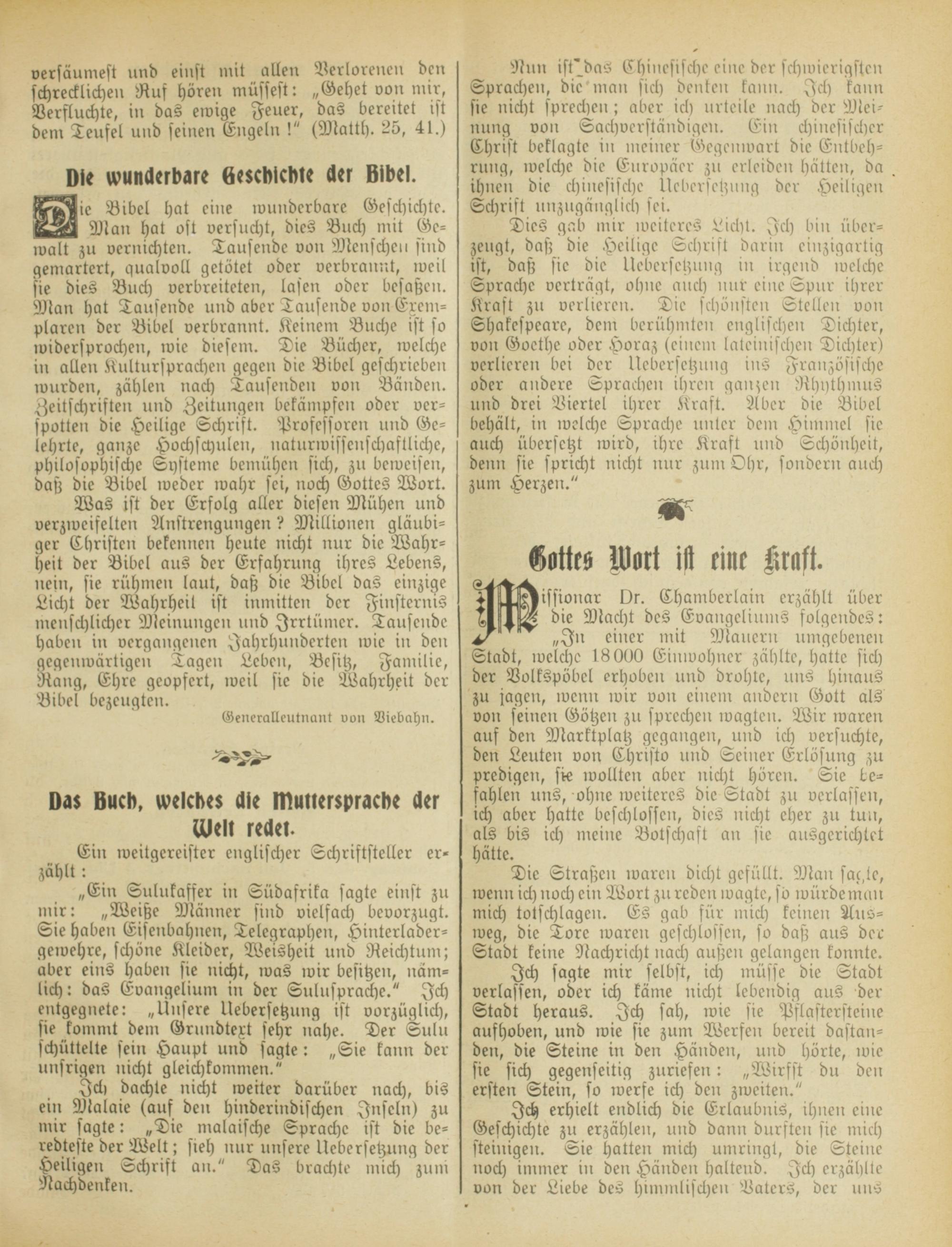 Dies gab mir iveiteres Licht. Ich biit überzeugt, daß die Heilige Schrift dariit einzigartig ist, daß sie die Uebersetzung in irgend ivelche Sprache verträgt, ohne auch nur eine Spur ihrer Kraft zil verlieren. Die schönsten Stellen von Shakespeare, den: berühmten eitglischen Dichter, voir Goethe oder Horaz (einem lateinischen Dichter) verlieren bei der Uebersetzung ins Französische oder andere Sprachen ihren ganzen Rhythmus tnid drei Viertel ihrer Kraft. Aber die Bibel behält, in ivelche Sprache unter dem Himmel sie auch übersetzt wird, ihre Kraft und Schönheit, denn sie spricht nicht nur zum Ohr, sondern auch zum Herzen."