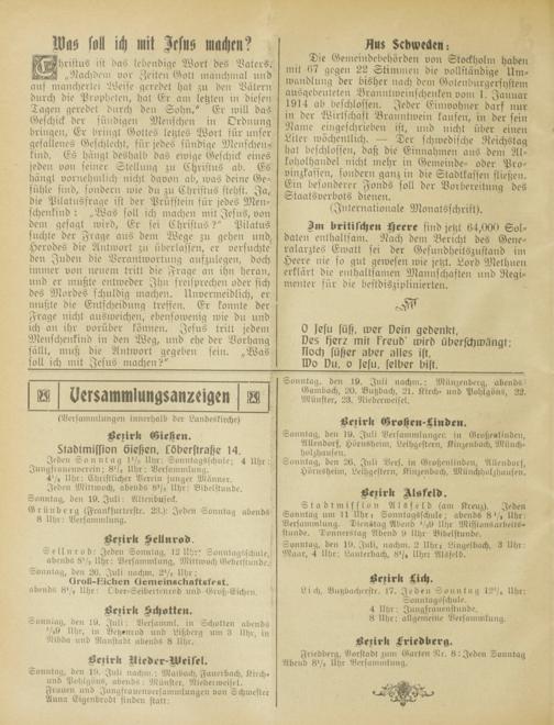 Sonntag, den 19. Juli nachm.: Maibach, Fauerbach, Kirch. und Pohlgöns, abends: ©fünfter, Niederweisel. Frauen und Jungfrauenversammlungen von Schwester Auna Eigenbrodt finden statt:
