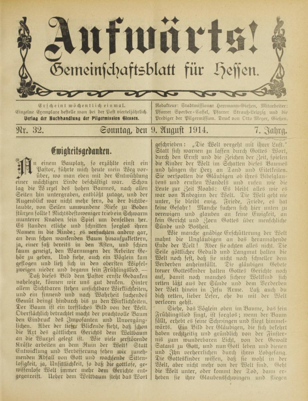 Redakteur: Stadtnussionar Herrmann-Gießen. Mitarbeiter: Pfarrer Sperber-Cassel, Pfarrer Strauß-Leipzig und die Prediger der Pilgermission. Druck von Otto Meyer, Gießen.