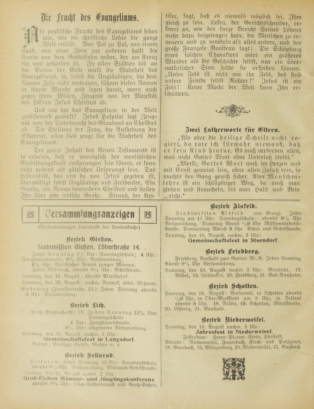 Sonntag, den 16. August: Versamml. in Schotten abends >/.,9 Uhr, in Ober-Mockstadt uni 3 Uhr, in Selters abends 8 Uhr. 18. Nidda, 19. Schotten, Bibelstunde, 20. Lißberg, 21. Ranstadt.