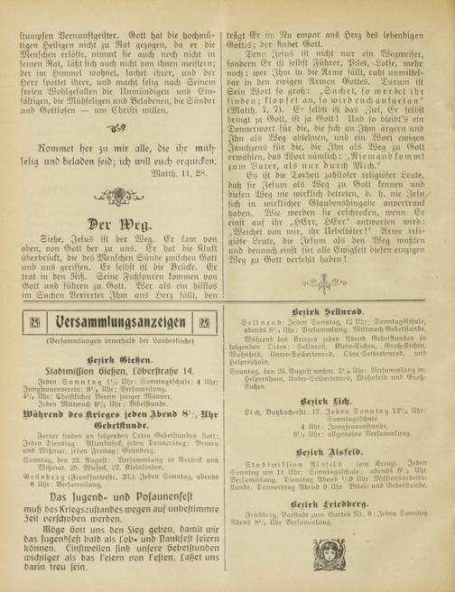 Sellnrod: Jeden Sonntag, 12 Uhr: Sonntagsschule, abends 8'/, Uhr: Versammlung, Mittwoch Gebeistunde. Während des Krieges jeden Abend Gebeistunden in folgenden Orten: Sellnrod, Klein-Eichen, Groß-Eichen, Wohnfeld, Unter-Seibertenrod, Ober-Seibertenrod, und Helpreshain.
