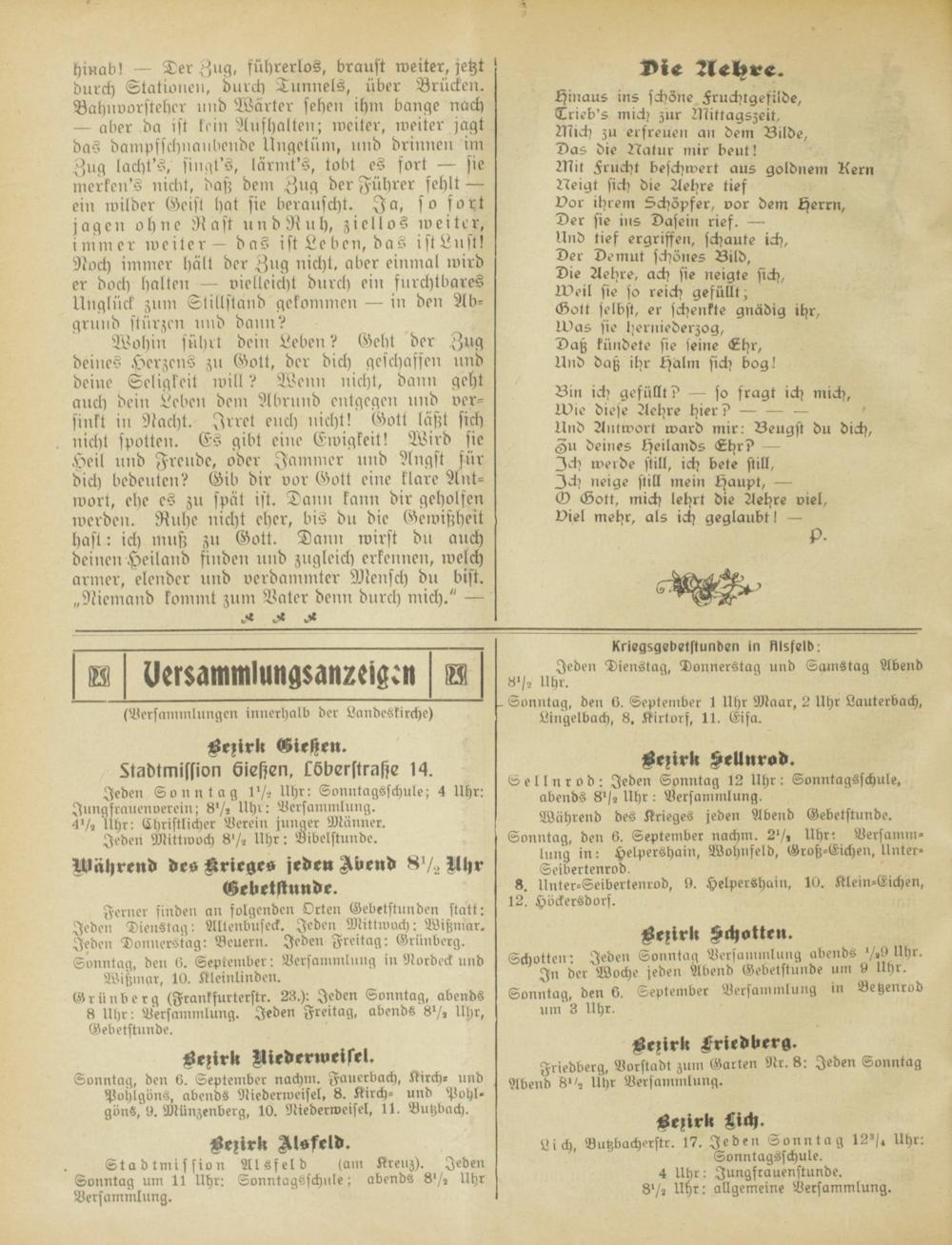 Während des Krieges jeden Abend Gebetstunde. Sonntag, den 6. September nachm. 27, Uhr: Versamm