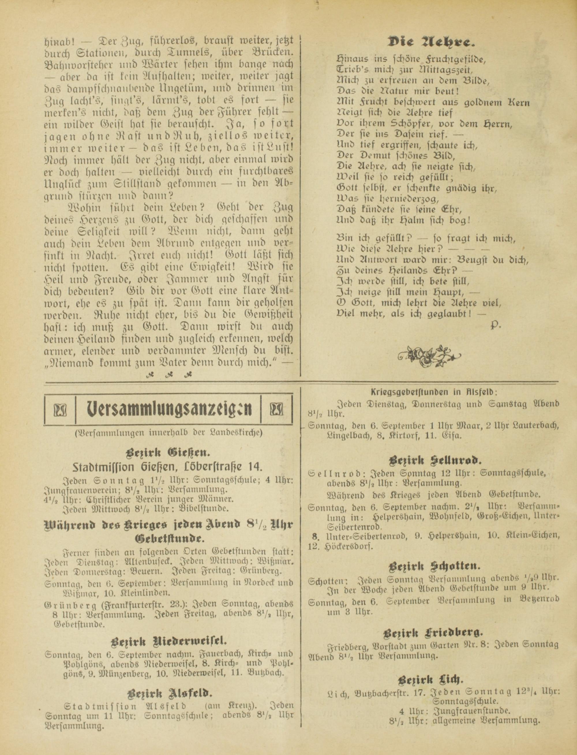 In der Woche jeden Abend Gebeistunde um 9 Uhr. Sonntag, den 6. September Versammlung in Betzenrod um 3 Uhr.