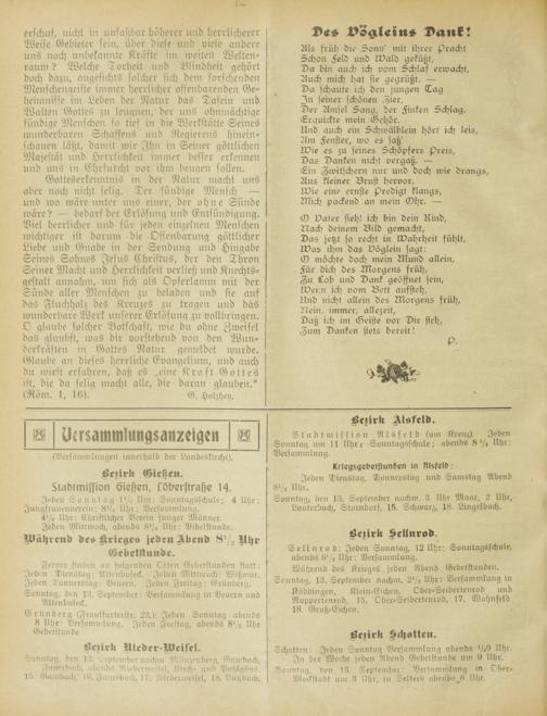 Während des Krieges jeden Abend Gebeistunden. Sonntag, 13. September nachm. 2'/-Uhr: Versammlung in Köddingen, Klein-Eichen, Ober-Seibertenrod und Ruppertenrod, 15. Ober-Seibertenrod, 17. Wohnfeld 18. Groß-Eichen.