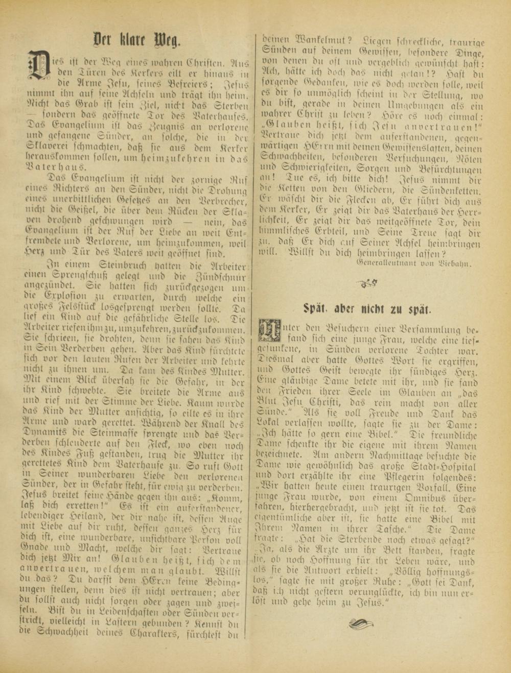 fand sich eine junge Frau, ivelche eine tief* gesunkene, in Sünden verlorene Tochter war. Diesiital aber hatte Gottes Wort sie ergriffen, und Gottes Geist beivegte ihr sündiges Herz. Eine gläubige Dame betete mit ihr, und sie fand den Frieden ihrer Seele im Glauben an „das Blut Iesll Christi, das rein macht von aller Sünde." Als sie voll Fretlde nub Dank das Lokal verlassen ivollle, sagte sie ztl der Dame: „Ich hatte so gern eine Bibel." Die fretindliche Dame schenkte ihr die eigene mit ihrem Namen bezeichnete. Am andern Nachmittage besuchte die Dame ivie gewöhnlich das große Stadt-Hospital und dort erzählte ihr eine Pflegerin folgendes: „Wir hatten heute einen traurigen Vorfall. Eine junge Frau wurde, von einem Omnibus überfahre», hierhergebracht, und jetzt ist sie tot. Das eigentümliche aber ist, sie hatte eine Bibel mit Ihrem Namen in ihrer Tasche." Die Dame fragte: „Hat die Sterbende noch etwas gesagt?"