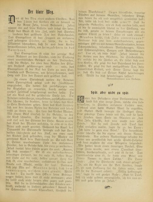 Das Evangelium ist nicht der zornige Bus eines Richters an den Sünder, nicht die Drodung eines unerbittlichen Gesetzes an den Berdrecher, nicht die Geißel, die über dem Rücken der Sklave» drohend geschwungen ivird — nein, das Evangelium ist der Bus der Liede au iveit Entfremdete und Verlorene, um heimzukommen, iveil Herz und Tür des Vaters iveit geöffnet sind.
