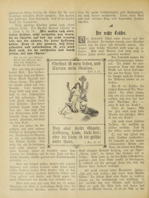 Seine Brust schmückt das eiserne Kreuz. Die gefalteten Hände ruhen auf dem Gewehr. Das brechende Auge blickt liach oben. Da sieht er eine Lichtsgestalt auf sich zukommen. Eine linde Hand berührt sanft seine Schulter. Das dorngekrönte Haupt neigt sich über ihn. Der letzte Blick des Sterbenden trifft das liebeitde Atige seiites Heilandes. Fürmahr, das heißt ein selig End!