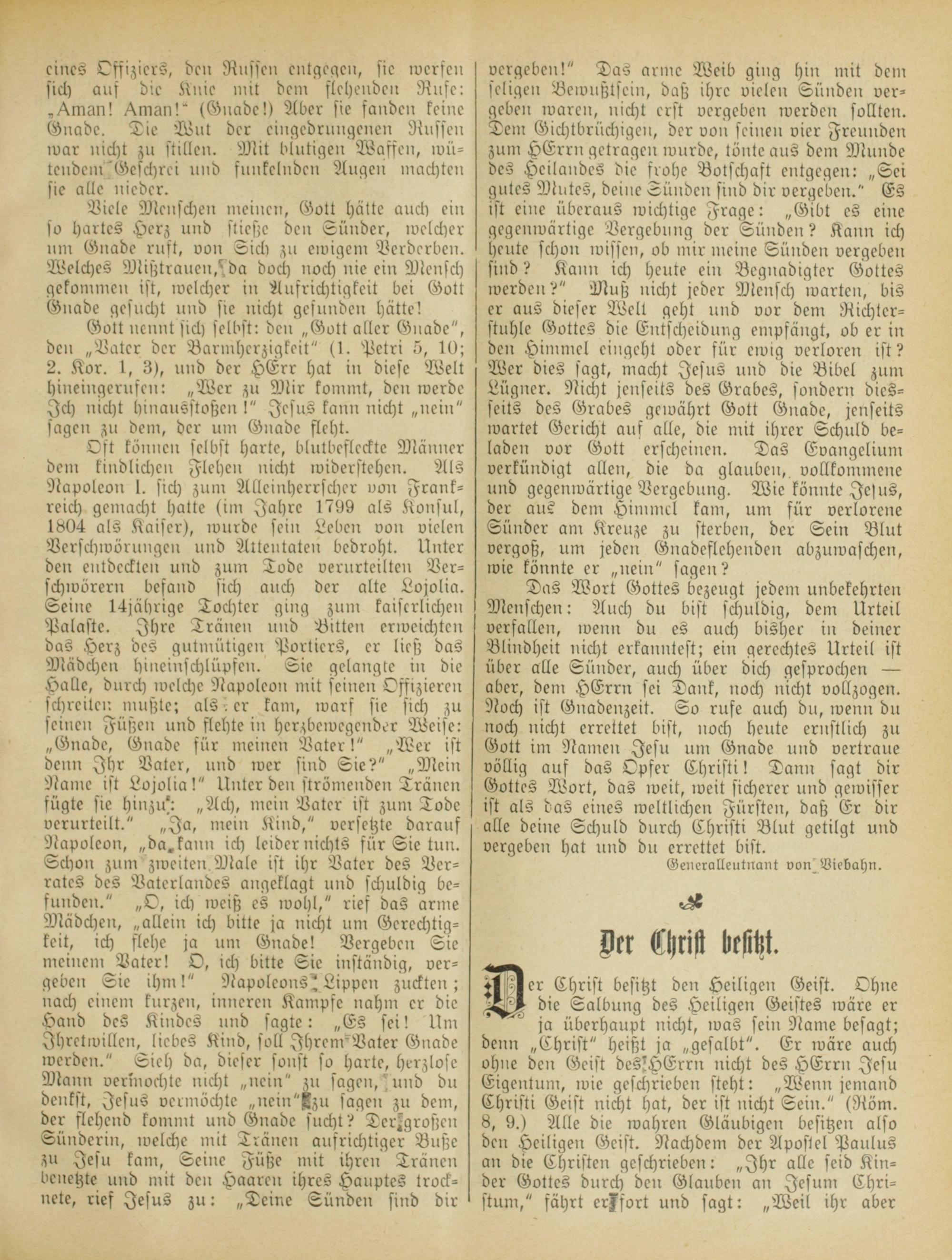 Oft können selbst harte, blutbefleckte Männer dem kindlichen Flehen nicht ividerstehcn. Als Napoleon I. sich zum Alleinherrscher von Frankreich gemacht hatte (im Jahre 1799 als Konsul, 1804 als Kaiser), wurde sein Leben von vielen Verschwörungen nnb Attentaten bedroht. Unter den entdeckten und zum Tode verurteilten Ver- schwörern befand sich auch der alte Lojolia. Seine 14jährige Tochter ging zum kaiserlichen Palastc. Ihre Tränen lind Bitten erweichten das Herz des gutmütigen Portiers, er ließ das Mädchen hineinschlüpfen. Sie gelangte in die Halle, durch welche Napoleon mit seinen Offizieren schreiten, mußte; als er kam, warf sie sich zu seinen Füßen und flehte in herzbewegender Weise: „Gnade, Gnade für meinen Vater!" „Wer ist denn Ihr Vater, und wer sind Sie?" „Mein Name ist Lojolia!" Unter den strömenden Tränen fügte sie hinzu': „Ach, mein Vater ist zum Tode