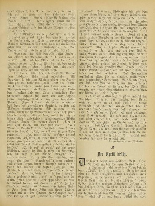 Das Wort Gottes bezeugt jedem unbekehrten Menschen: Auch du bist schuldig, dem Urteil verfallen, ivenn du es auch bisher in deiner Blindheit nicht erkanntest; ein gerechtes Urteil ist über alle Sünder, auch über dich gesprochen — aber, dem HErrn sei Dank, noch nicht vollzogen. Noch ist Gnadenzeit. So rufe auch bn, wenn du noch nicht errettet bist, noch heute ernstlich zu Gott im Namen Jesu um Gnade und vertraue völlig auf das Opfer Christi! Dann sagt dir Gottes Wort, das weit, weit sicherer und geivisser ist als das eines weltlichen Fürsten, daß Er dir alle deine Schuld durch Christi Blut getilgt und vergeben hat und bit errettet bist.