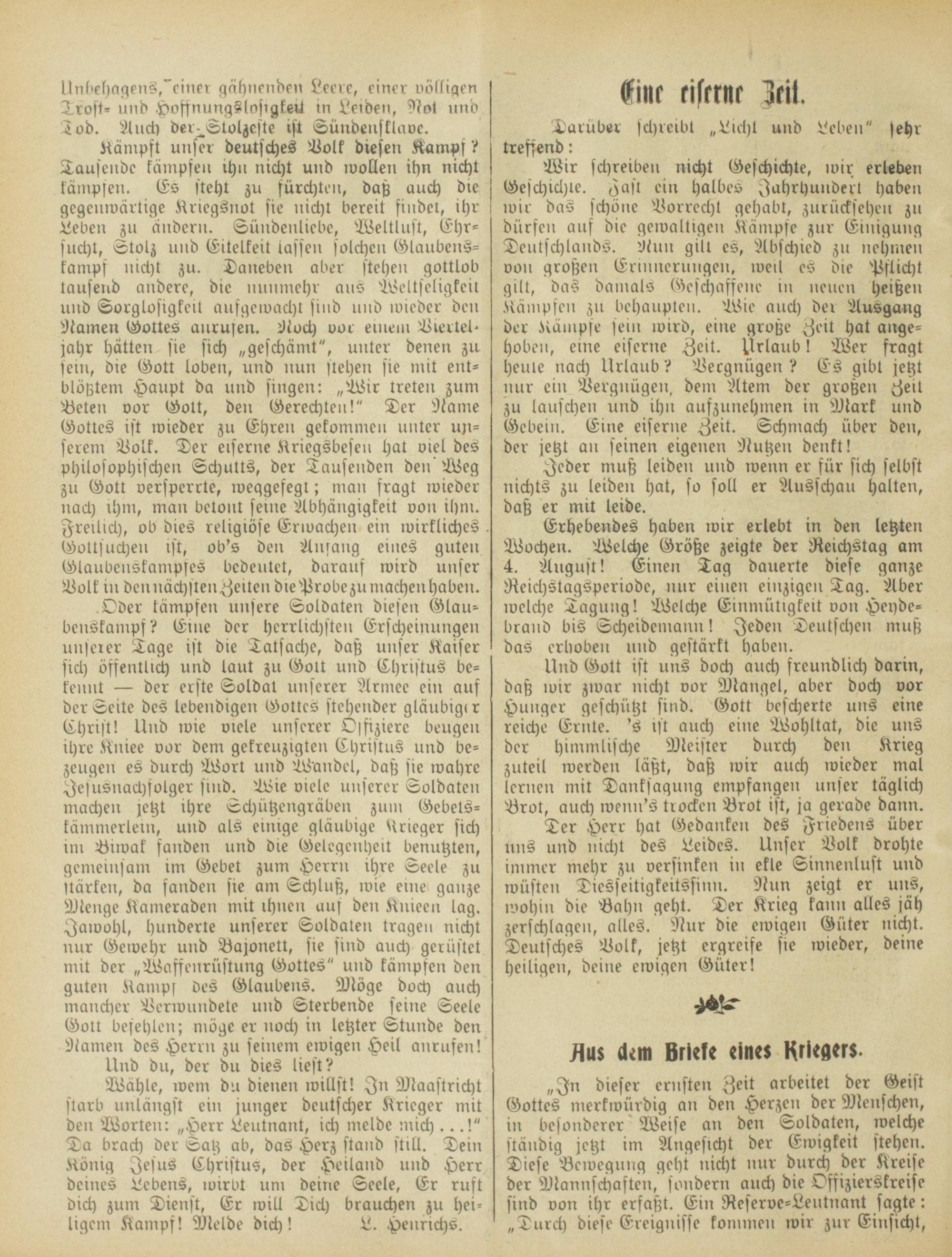 „In dieser ernsten Zeit arbeitet der Geist Gottes merkwürdig an den Herzen der Menschen, in besonderer Weise an den Soldaten, welche ständig jetzt im Angesicht der Ewigkeit stehen. Diese Bewegung geht nicht nur durch der Kreise der Mannschaften, sondern auch die Offizierskreise sind von ihr erfaßt. Ein Reserve-Leutnant sagte: „Durch diese Ereignisse kommen wir zur Einsicht,