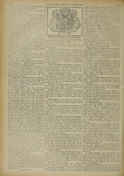 Wir bringen im Bilde das neue Wappen von Albanien. Es ist ähnlich dem früheren, der Doppeladler trägt als Brust- schild das Wappen des Fürsten von Wied.