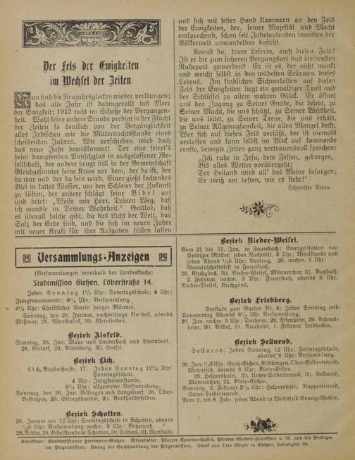 Redakteur: Stadtmisstonar Herrmann⸗Gießen. Mitarbeiter: Pfarrer Sperber⸗Cassel, Pfarrer Mockert-Frankfurt a. M. und die Prediger der Pilgermisston. Verlag der Buchhandlung der Pilgermisston. Druck von Otto Meyer in Gießen, Ludwigstr. 30. 1