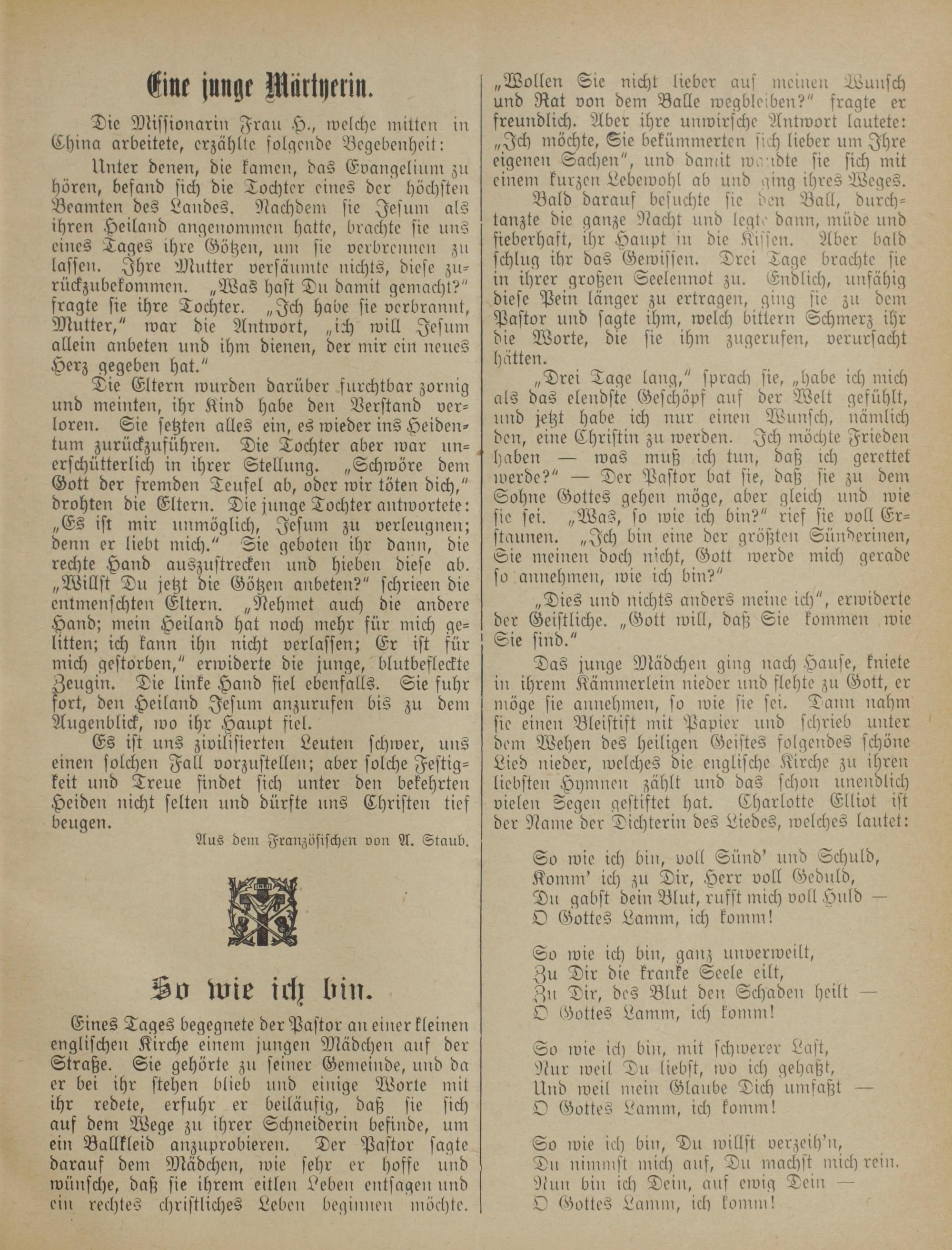Das junge Mädchen ging nach Hause, kniete in ihrem Kämmerlein nieder und flehte zu Gott, er möge sie annehmen, so wie sie sei. Dann nahm sie einen Bleistift mit Papier und schrieb unter dem Wehen des heiligen Geistes folgendes schöne Lied nieder, welches die englische Kirche zu ihren liebsten Hymnen zählt und das schon unendlich vielen Segen gestiftet hat. Charlotte Elliot ist der Name der Dichterin des Liedes, welches lautet: