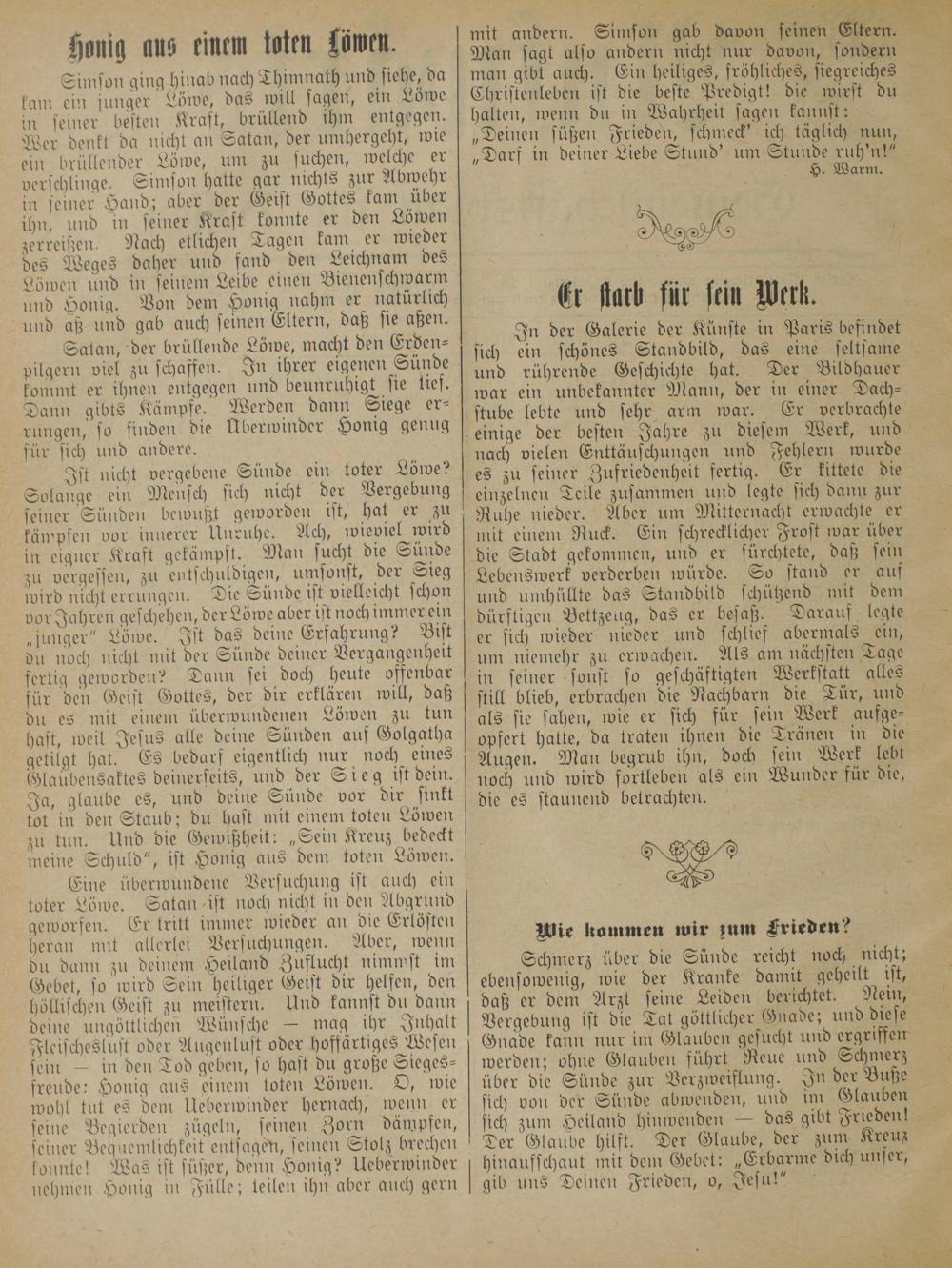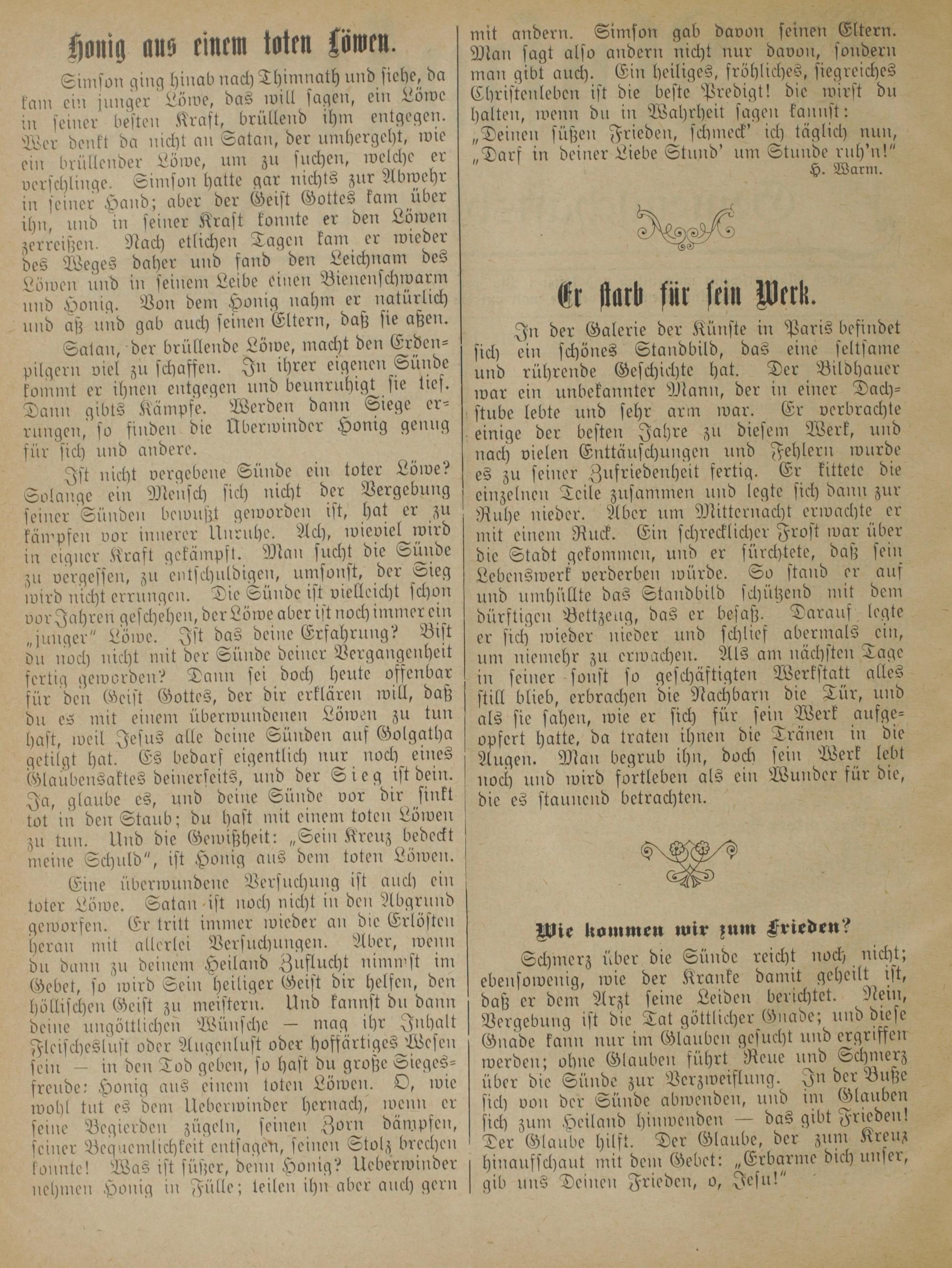Satan, der brüllende Löwe, macht den Erden⸗ pilgern viel zu schaffen. In ihrer eigenen Sünde kommt er ihnen entgegen und beunruhigt sie tief. Dann gibts Kämpfe. Werden dann Siege er— rungen, so finden die Überwinder Honig genug für sich und andere.