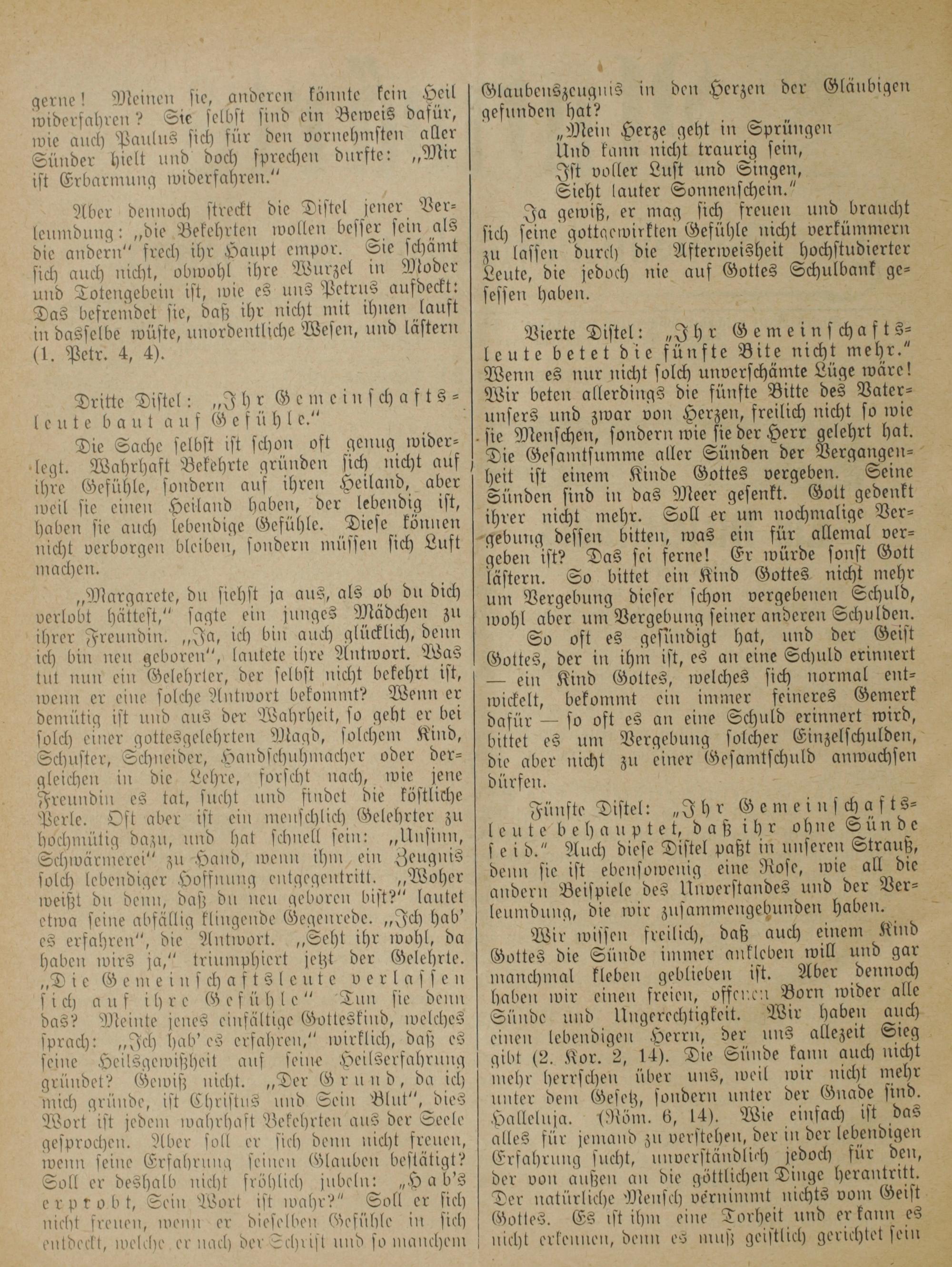 Vierte Distel:„Ihr Gemeinschafts⸗ leute betet die fünfte Bite nicht mehr.“ Wenn es nur nicht solch unverschämte Lüge wäre! Wir beten allerdings die fünfte Bitte des Vater- unsers und zwar von Herzen, freilich nicht so wie