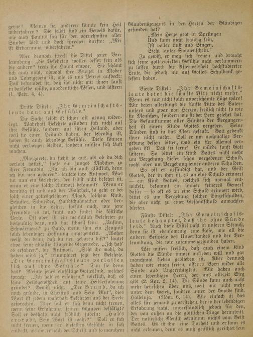„Margarete, du siehst ja aus, als ob du dich verlobt hättest,“ sagte ein junges Mädchen zu ihrer Freundin.„Ja, ich bin auch glücklich, denn ich bin neu geboren“, lautete ihre Antwort. Was tut nun ein Gelehrter, der selbst nicht bekehrt ist, wenn er eine solche Antwort bekommt? Wenn er demütig ist und aus der Wahrheit, so geht er bei solch einer gottesgelehrten Magd, solchem Kind, Schuster, Schneider, Handsehuhmacher oder der— gleichen in die Lehre, forscht nach, wie jene Freundin es tat, sucht und findet die köstliche Perle. Oft aber ist ein menschlich Gelehrter zu hochmütig dazu, und hat schnell sein:„Unsinn, Schwärmerei“ zu Hand, wenn ihm, ein Zeugnis solch lebendiger Hoffnung entgegentritt.„Woher weißt du denn, daß du neu geboren bist?“ lautet etwa seine abfällig klingende Gegenrede.„Ich hab' es erfahren“, die Antwort.„Seht ihr wohl, da haben wirs ja,“ triumphiert jetzt der Gelehrte. Die Gemeinschaftsleute verlassen sich auf ihre Gefühle“ Tun sie denn