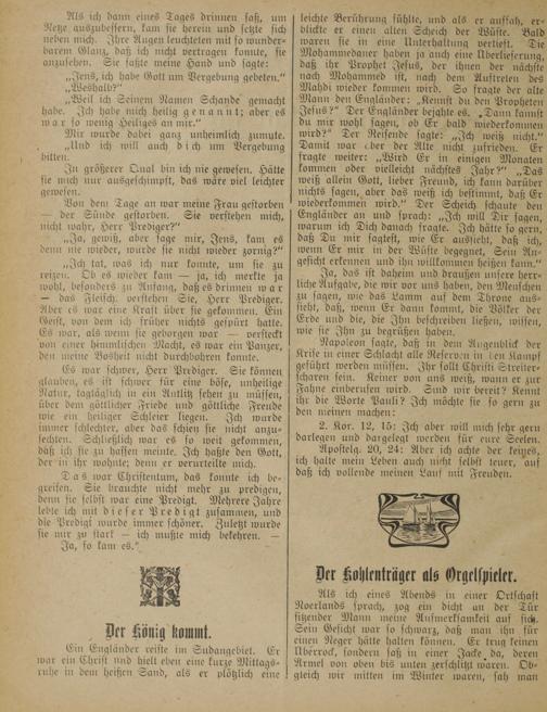 Der König kommt. Ein Engländer reiste im Sudangebiet. Er war ein Christ und hielt eben eine kurze Mittags— ruhe in dem heißen Sand, als er plötzlich eine