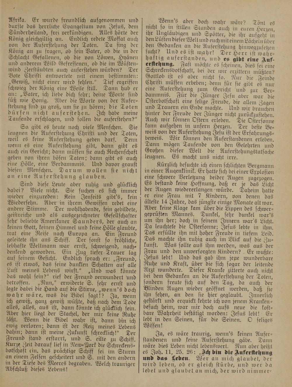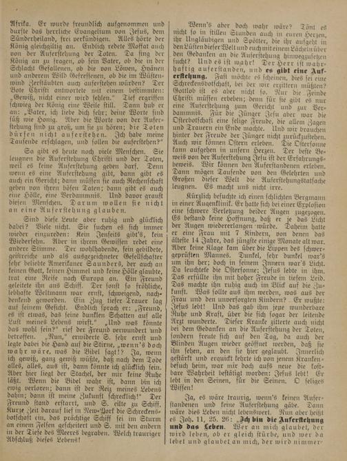Ja, es wäre traurig, wenn's keinen Aufer— standenen und keine Auferstehung gäbe. Dann wäre dies Leben nicht lebenswert. Nun aber heißt es Joh. 11, 25. 26:„Ich bin die Auferstehung und das Leben. Wer an mich glaubet, der wird leben, ob er gleich stürbe, und wer da lebet und glaubet an mich, der wird nimmer—