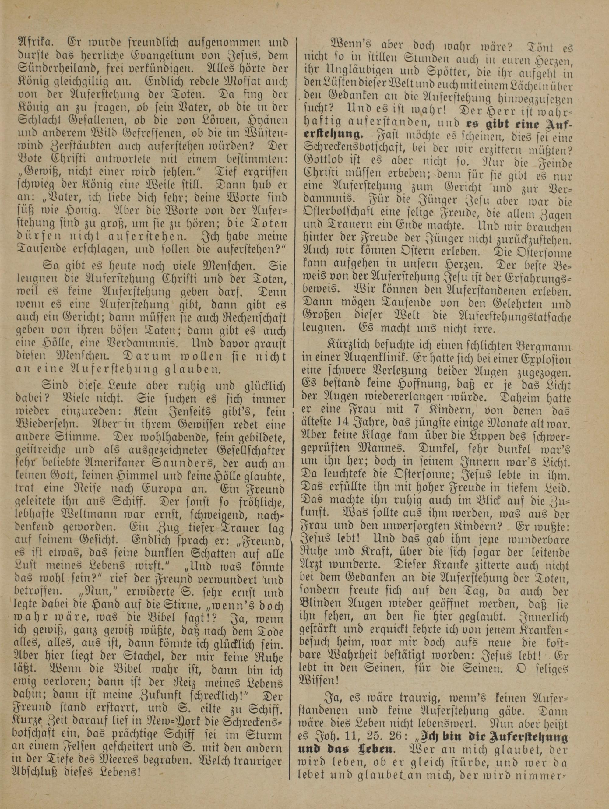 Kürzlich besuchte ich einen schlichten Bergmann in einer Augenklinik. Er hatte sich bei einer Explosion eine schwere Verletzung beider Augen zugezogen. Es bestand keine Hoffnung, daß er je das Licht der Augen wiedererlangen würde. Daheim hatte er eine Frau mit 7 Kindern, von denen das älteste 14 Jahre, das jüngste einige Monate alt war. Aber keine Klage kam über die Lippen des schwer— geprüften Mannes. Dunkel, sehr dunkel war's um ihn her; doch in seinem Innern war's Licht. Da leuchtete die Ostersonne; Jesus lebte in ihm. Das erfüllte ihn mit hoher Freude in tiefem Leid. Das machte ihn ruhig auch im Blick auf die Zu⸗ kunft. Was sollte aus ihm werden, was aus der Frau und den unversorgten Kindern? Er wußte: Jesus lebt! Und das gab ihm jene wunderbare Ruhe und Kraft, über die sich sogar der leitende Arzt wunderte. Dieser Kranke zitterte auch nicht bei dem Gedanken an die Auferstehung der Toten, sondern freute sich auf den Tag, da auch der Blinden Augen wieder geöffnet werden, daß sie ihn sehen, an den sie hier geglaubt. Innerlich gestärkt und erquickt kehrte ich von jenem Kranken- besuch heim, war mir doch aufs neue die kost— bare Wahrheit bestätigt worden: Jesus lebt! Er lebt in den Seinen, für die Seinen. O seliges Wissen!