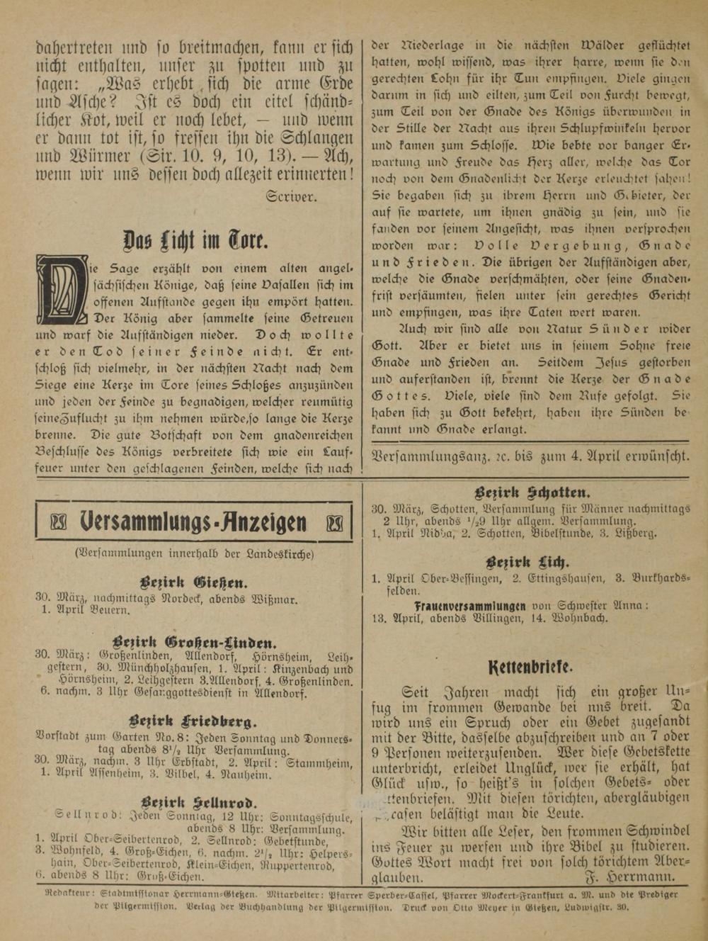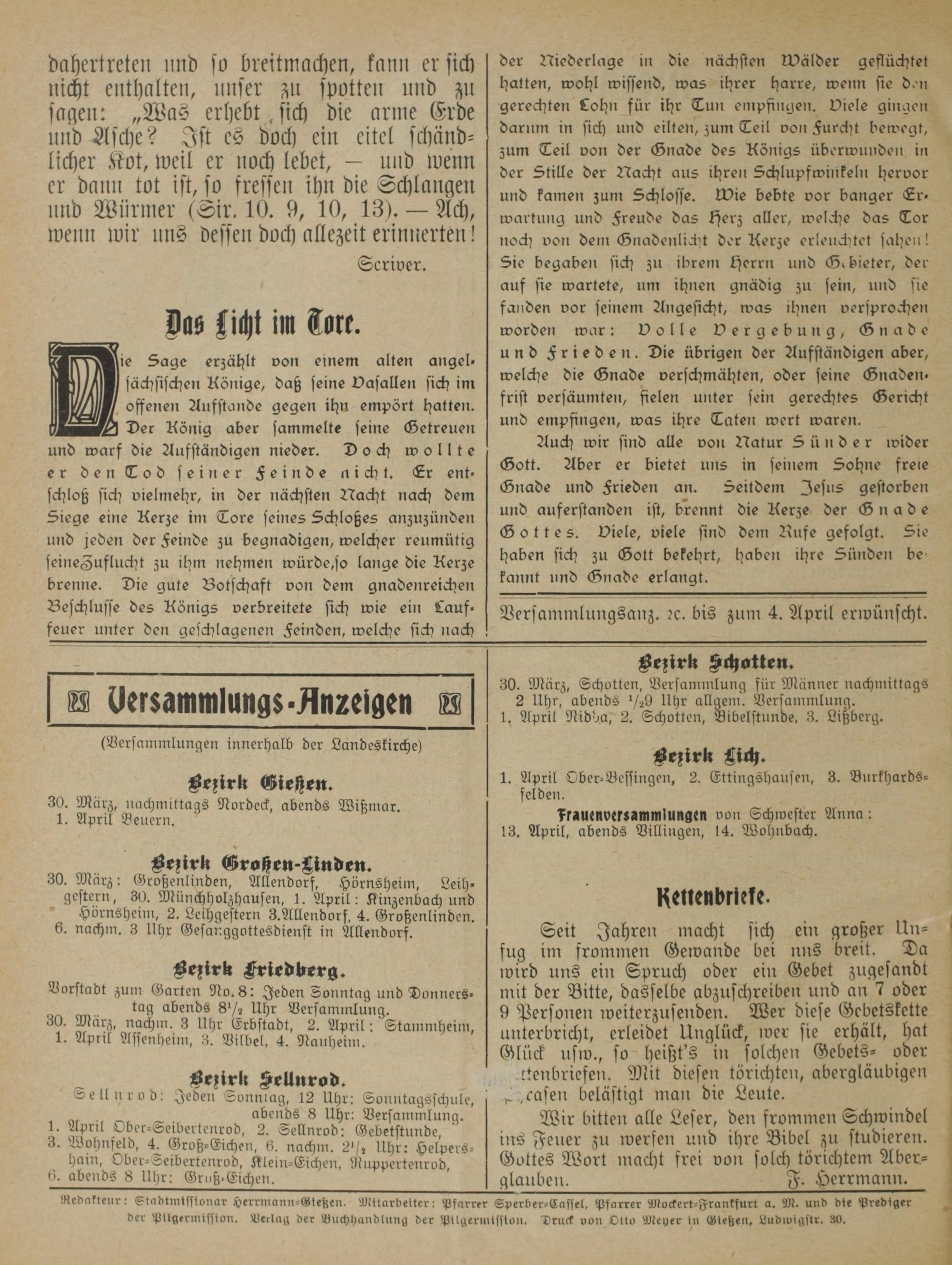 Redakteur: Stadtmtsstonar Herrmann-Gteßen. Mitarbeiter: Pfarrer Sperber⸗Cassel, Pfarrer Mockert⸗Frankfurt a. M. und die Prediger der Pilgermisston. Verlag der Buchhandlung der Pilgermisston. Druck von Otto Meyer in Gießen, Ludwigstr. 30.