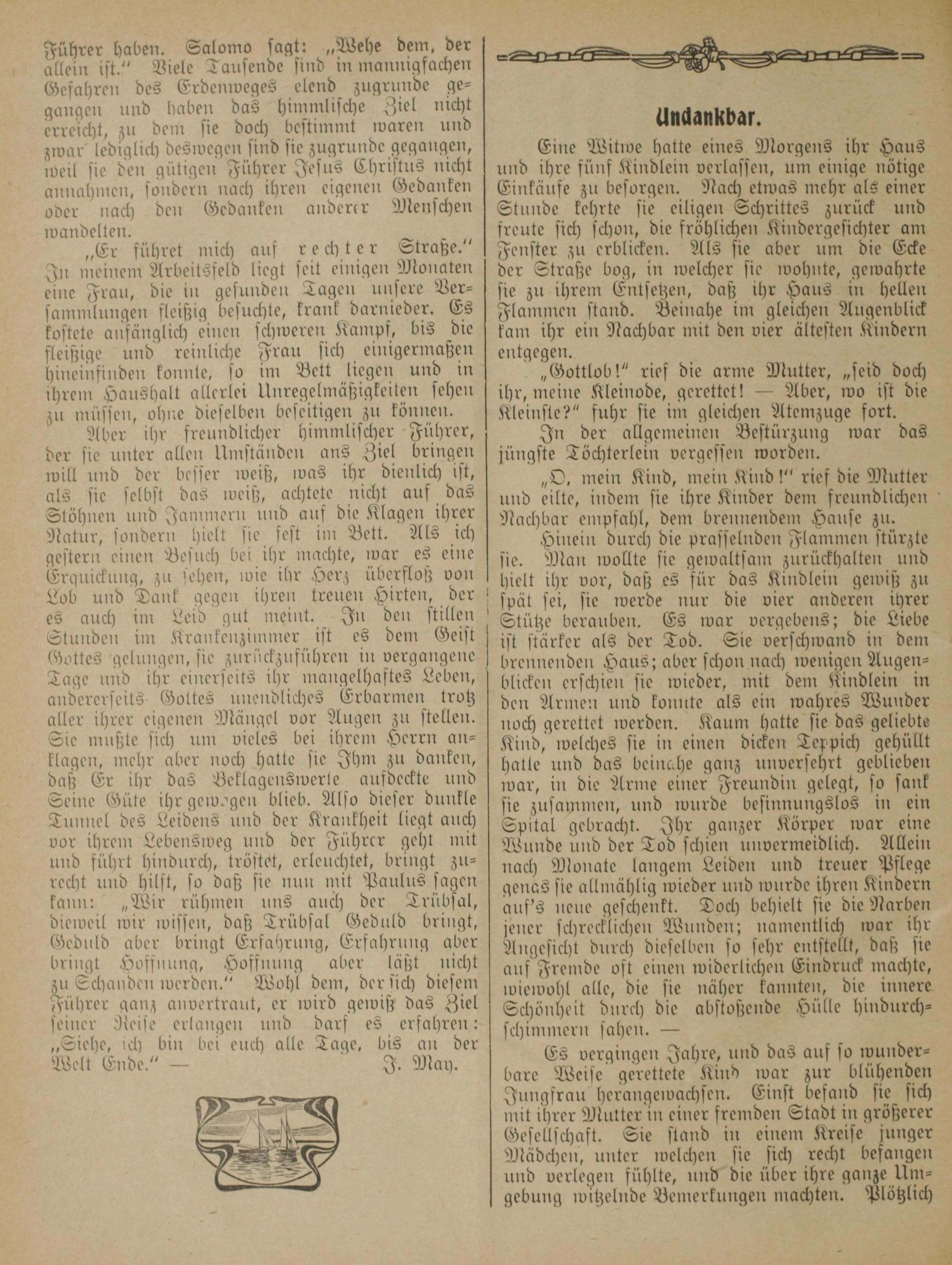 In meinem Arbeitsfeld liegt seit einigen Monaten eine Frau, die in gesunden Tagen unsere Ver— sammlungen fleißig besuchte, krank darnieder. Es kostete anfänglich einen schweren Kampf, bis die fleißige und reinliche Frau sich einigermaßen hineinfinden konnte, so im Bett liegen und in ihrem Haushalt allerlei Unregelmäßigkeiten sehen zu müssen, ohne dieselben beseitigen zu können. Aber ihr freundlicher himmlischer Führer, der sie unter allen Umständen ans Ziel bringen will und der besser weiß, was ihr dienlich ist, als sie selbst das weiß, achtete nicht auf das Stöhnen und Jammern und auf die Klagen ihrer Natur, sondern hielt sie fest im Bett. Als ich gestern einen Besuch bei ihr machte, war es eine Erquickung, zu sehen, wie ihr Herz überfloß von Lob und Dank gegen ihren treuen Hirten, der es auch im Leid gut meint. In den stillen Stunden im Krankenzimmer ist es dem Geist Gottes gelungen, sie zurückzuführen in vergangene Tage und ihr einerseits ihr mangelhaftes Leben, andererseits Gottes unendliches Erbarmen trotz aller ihrer eigenen Mängel vor Augen zu stellen. Sie mußte sich um vieles bei ihrem Herrn an— klagen, mehr aber noch hatte sie Ihm zu danken, daß Er ihr das Beklagenswerte aufdeckte und Seine Güte ihr gewogen blieb. Also dieser dunkle Tunnel des Leidens und der Krankheit liegt auch vor ihrem Lebensweg und der Führer geht mit und führt hindurch, tröstet, erleuchtet, bringt zu— recht und hilft, so daß sie nun mit Paulus sagen kann:„Wir rühmen uns auch der Trubsal, dieweil wir wissen, daß Trübsal Geduld bringt, Geduld aber bringt Erfahrung, Erfahrung aber bringt Hoffnung, Hoffnung aber läßt nicht zu Schanden werden.“ Wohl dem, der sich diesem Führer ganz anvertraut, er wird gewiß das Ziel seiner Reise erlangen und darf es erfahren: „Siehe, ich bin bei euch alle Tage, bis an der Welt Ende.“— J. May.
