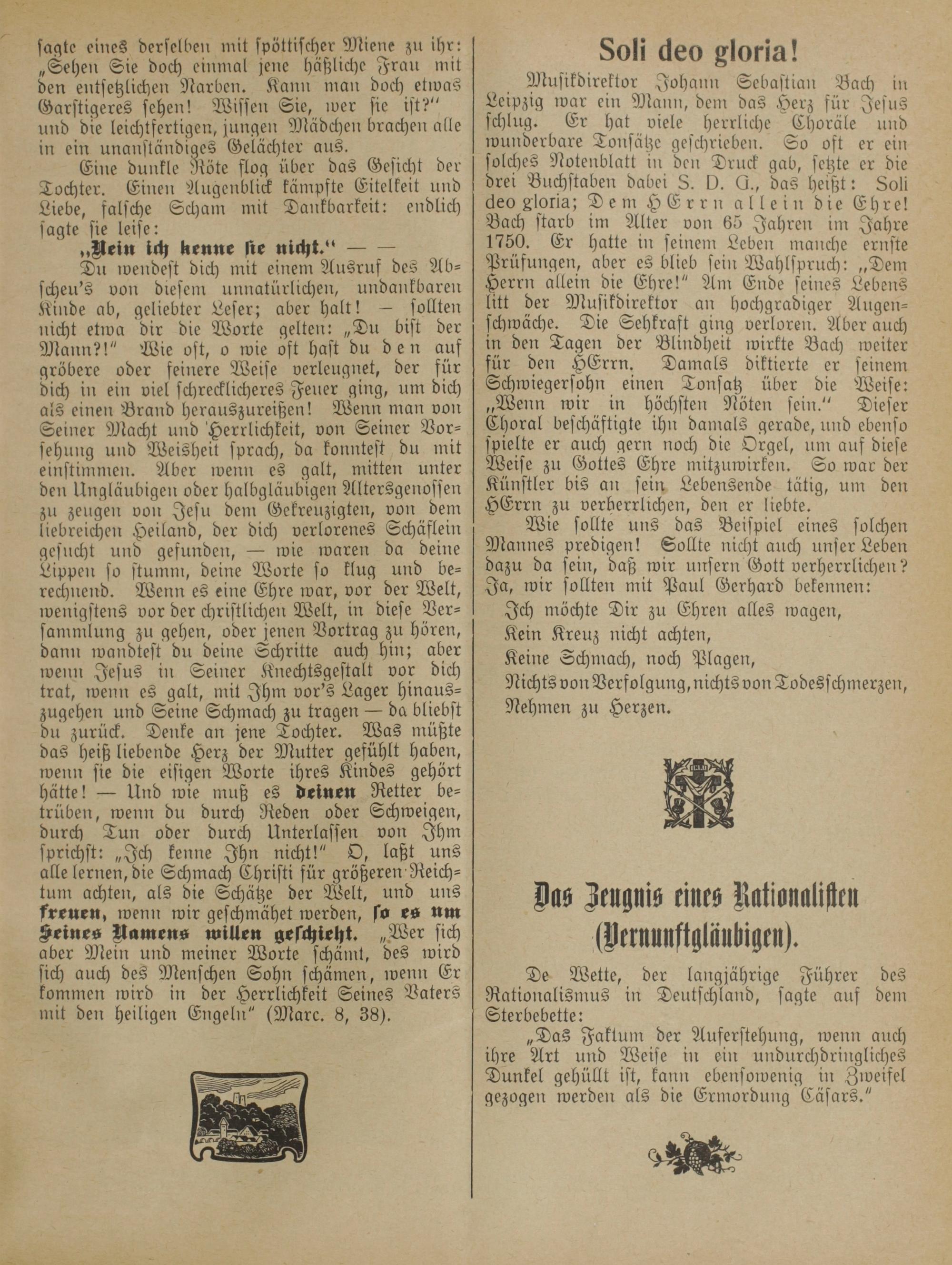 Musikdirektor Johann Sebastian Bach in Leipzig war ein Mann, dem das Herz für Jesus schlug. Er hat viele herrliche Choräle und wunderbare Tonsätze geschrieben. So oft er ein solches Notenblatt in den Druck gab, setzte er die drei Buchstaben dabei 8. D. G., das heißt: Soli deo gloria; Dem HErrn allein die Ehrel Bach starb im Alter von 65 Jahren im Jahre 1750. Er hatte in seinem Leben manche ernste Prüfungen, aber es blieb sein Wahlspruch:„Dem Herrn allein die Ehre!“ Am Ende seines Lebens litt der Musikdirektor an hochgradiger Augen— schwäche. Die Sehkraft ging verloren. Aber auch in den Tagen der Blindheit wirkte Bach weiter für den HErrn. Damals diktierte er seinem Schwiegersohn einen Tonsatz über die Weise: „Wenn wir in höchsten Nöten sein.“ Dieser Choral beschäftigte ihn damals gerade, und ebenso spielte er auch gern noch die Orgel, um auf diese Weise zu Gottes Ehre mitzuwirken. So war der Künstler bis an sein Lebensende tätig, um den HErrn zu verberrlichen, den er liebte.