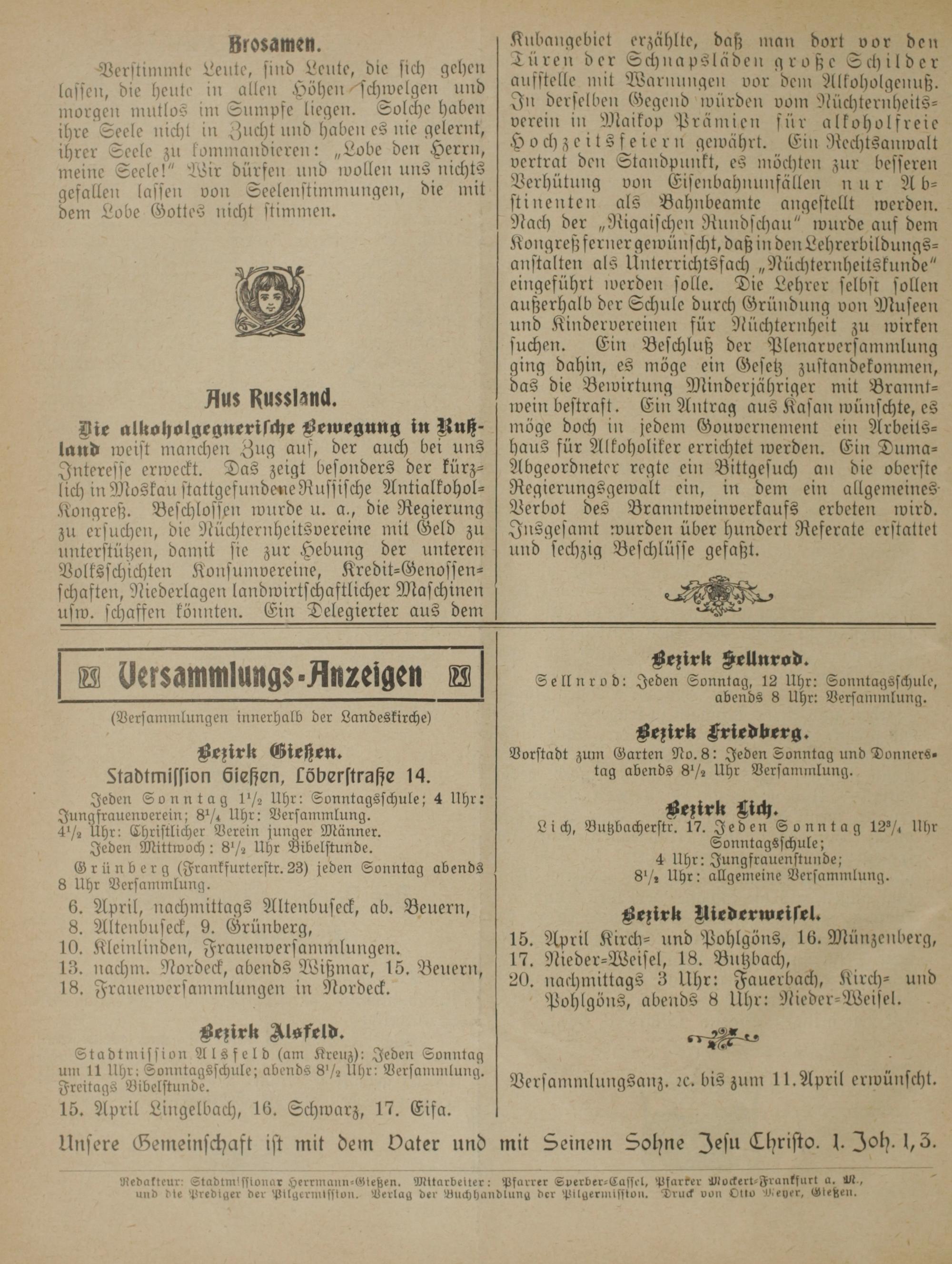 Stadtmission Gießen, Cöberstraße 14. Jeden Sonntag 1½ Uhr: Sonntagsschule; 4 Uhr: Jungfrauenverein; 8¼ Uhr: Versammlung. 4½ Uhr: Christlicher Verein junger Männer. Jeden Mittwoch: 8½ Uhr Bibelstunde. Grünberg(Frankfurterstr. 23) jeden Sonntag abends 8 Uhr Versammlung. 6. April, nachmittags Altenbuseck, ab. Beuern, 8. Altenbuseck, 9. Grünberg, 10. Kleinlinden, Frauenversammlungen. 13. nachm. Nordeck, abends Wißmar, 15. Beuern, 18. Frauenversammlungen in Nordeck.