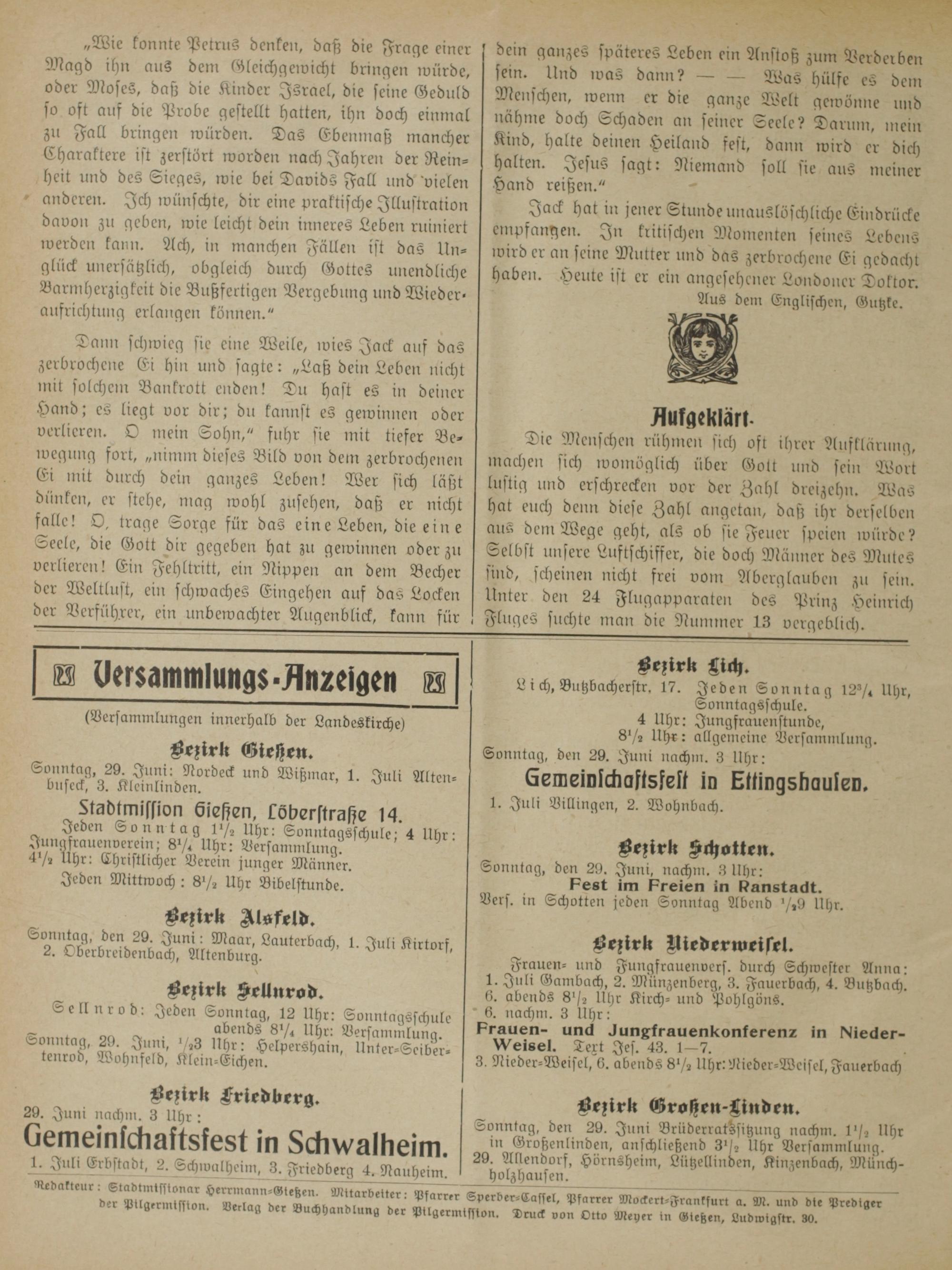 Bezirk Lich. Lich, Butzbacherstr. 17. Jeden Sonntag 12¼ Uhr, Sonntagsschule. 4 Uhr: Jungfrauenstunde, 8½ Uhr: allgemeine Versammlung.