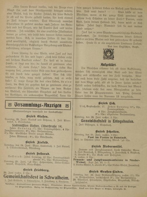Sonntag, den 29. Juni Brüderratssitzung nachm. 1½ Uhr in Großenlinden, anschließend 3½ Uhr Versammlung. 29. Allendorf, Hörnsheim, Lützellinden, Kinzenbach, Münch-