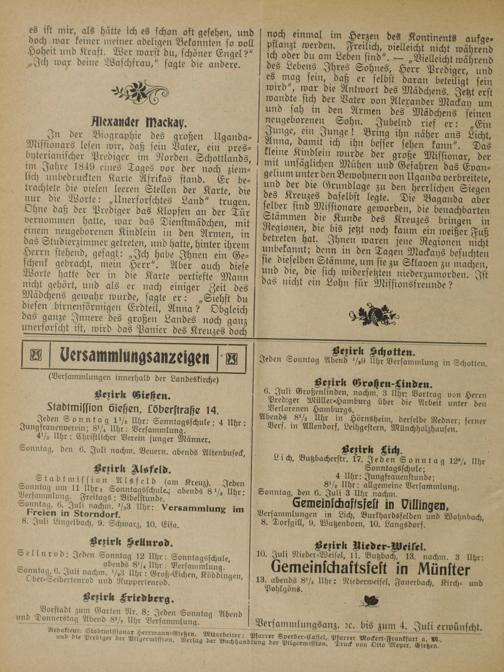Stadtmission Gießen, Cöberstraße 14. Jeden Sonntag 1½ Uhr: Sonntagsschule; 4 Uhr: Jungfrauenverein; 8¼ Uhr: Versammlung. 4½ Uhr: Christlicher Verein junger Männer.