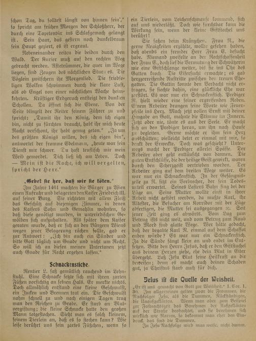 Sie saßen beim Kränzchen. Frau N., die gerne Neuigkeiten erzählte, wollte gesehen haben, daß abends ein fremder Herr Frau E. besucht habe. Niemand zweifelte an der Rechtschaffenheit der Frau E., doch lief die Vermutung der Schwätzerin wie eine Giftschlange weiter, bis sie ins Ohr des Gatten kroch. Die Eifersucht erwachte; es gab herzzerreißende Auftritte zwischen den treuen Ehe— gatten. Die Gattin konnte den Verdacht nicht er— tragen, sie siechte dahin, eine glückliche Ehe war zerstört. Es war nur ein Schnackenstich. Prediger R. hielt wieder eine seiner ergreifenden Reden. Einem Arbeiter drangen seine Worte wie Feuer— pfeile ins Herz. Mach jetzt vollen Ernst mit deiner Hingabe an Gott, mahnte die Stimme im Innern. Jetzt oder nie, tönte es aus der Seele. Er macht sich an den Prediger heran, um ihn nach Hause zu begleiten. Gerne möchte er ihm sein Herz ausschütten; vielleicht betet er einmal mit mir, so
