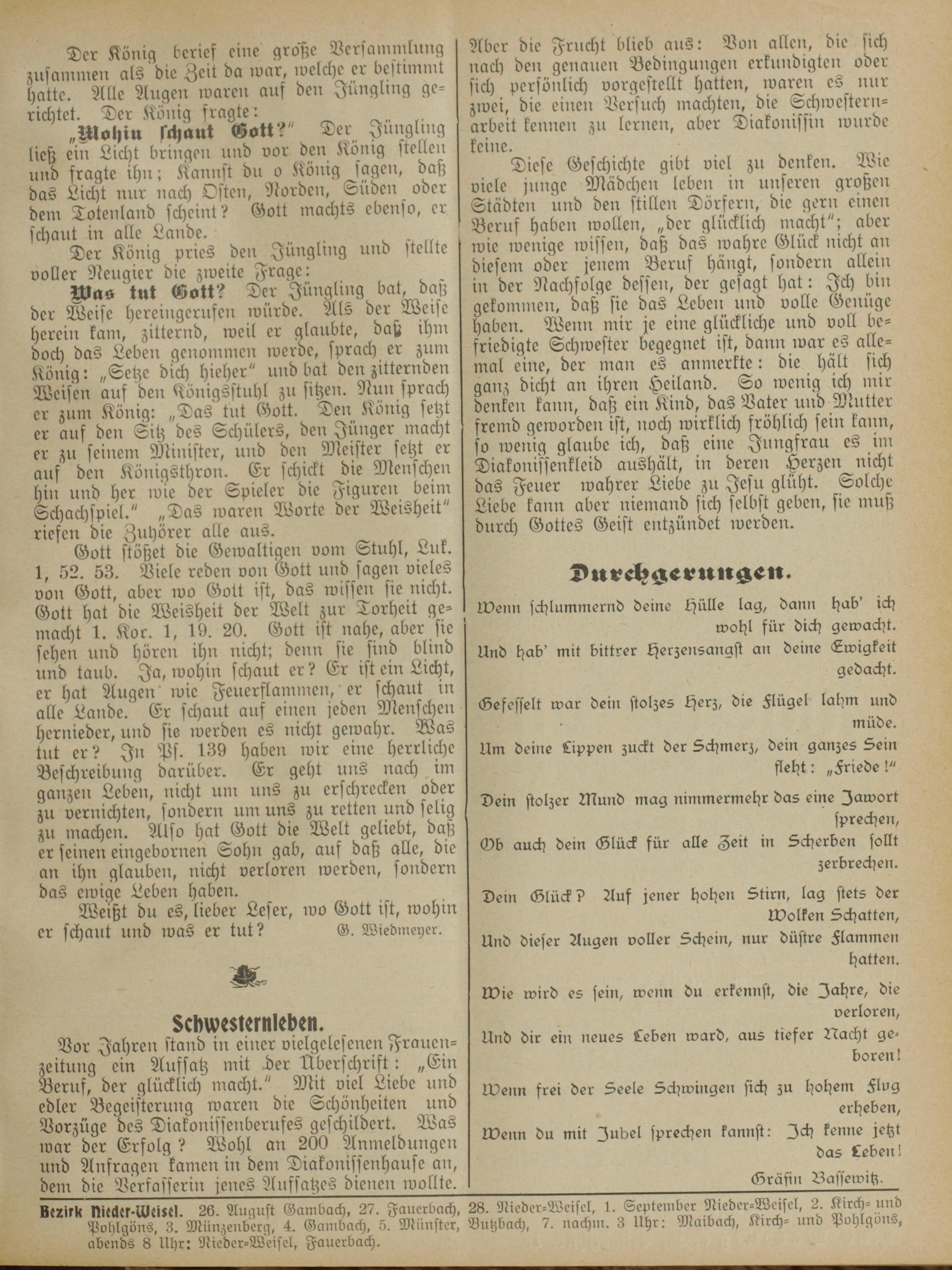 28. Nieder⸗Weisel, 1. September Nieder-Weisel, 2. Kirch- und Pohlgöns, 3. Münzenberg, 4. Gambach, 5. Münster, Butzbach, 7. nachm. 3 Uhr: Maibach,