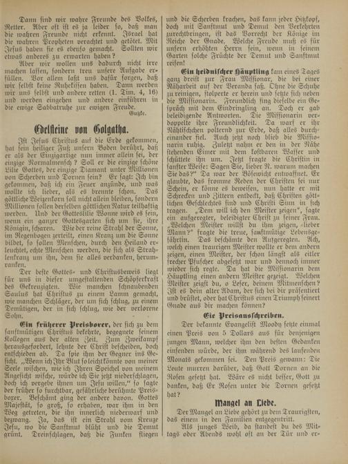 Ein heidnischer Häuptling kam eines Tages ganz dreist zur Frau Missionar, die bei einer Näharbeit auf der Veranda saß. Ohne die Schuhe zu reinigen, stolperte er herein und setzte sich neben die Missionarin. Freundlich fing dieselbe ein Ge— spräch mit dem Eindringling an. Doch er gab beleidigende Antworten. Die Missionarin ver— doppelte ihre Freundlichkeit. Da warf er ihr Nähtischchen polternd zur Erde, daß alles durch— einander fiel. Auch jetzt noch blieb die Missio— narin ruhig. Zuletzt nahm er den in der Nähe stehenden Eimer mit dem kostbaren Wasser und schüttete ihn um. Jetzt fragte die Christin in sanfter Weise: Sagen Sie, lieber N. warum machen Sie das?“ Da war der Bösewicht entwaffnet. Er glaubte, das fromme Reden der Christen sei nur Schein, er könne es beweisen, nun hatte er mit Schrecken und Zittern entdeckt, daß Christen gött— lichen Geschlechtes sind und Christi Sinn in sich tragen.„Dem will ich den Meister zeigen“, sagte ein aufgeregter, beleidigter Christ zu seiner Frau. „Welchen Meister willst du ihm zeigen, lieber Mann?“ fragte die treue, sanftmütige Lebensge— fährtin. Das beschämte den Aufgeregten. Ach, welch einen traurigen Meister wollte er dem andern zeigen, einen Meister, der schon längst als eitler frecher Pfuscher abgesetzt war und dennoch immer wieder sich regte. Da hat die Missionarin dem Häuptling einen andern Meister gezeigt. Welchen Meister zeigst du, o Leser, deinem Mitmenschen? Ist es dein alter Adam, der sich bei dir präsentiert und brüstet, oder hat Christus einen Triumph seinert Gnade aus dir machen können?