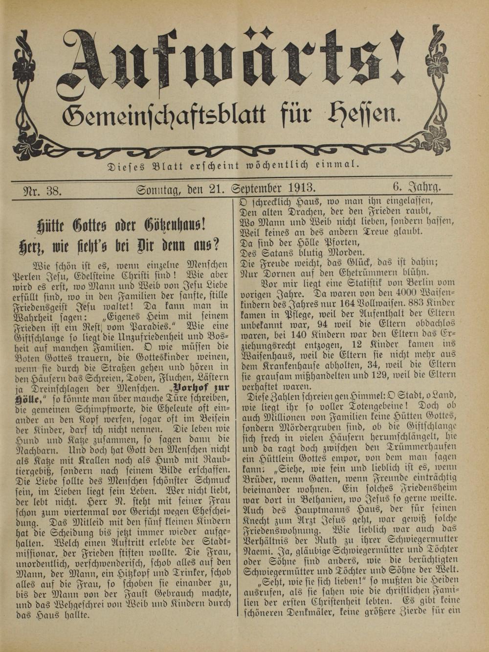 Diese Zahlen schreien gen Himmel: O Stadt, o Land, wie liegt ihr so voller Totengebeine! Doch ob auch Millionen von Familien keine Hütten Gottes, sondern Mördergruben sind, ob die Giftschlange sich frech in vielen Häusern herumschlängelt, hie und da ragt doch zwischen den Trümmerhaufen ein Hüttlein Gottes empor, von dem man sagen kann!„Siehe, wie fein und lieblich ist es, wenn Brüder, wenn Gatten, wenn Freunde einträchtig beieinander wohnen. Ein solches Friedensheim war dort in Bethanien, wo Jesus so gerne weilte. Auch des Hauptmanns Haus, der für seinen Knecht zum Arzt Jesus geht, war gewiß solche Friedenswohnung. Wie lieblich war auch das Verhältnis der Ruth zu ihrer Schwiegermutter Naemi. Ja, gläubige Schwiegermütter und Töchter oder Söhne sind anders, wie die berüchtigten Schwiegermütter und Töchter und Söhne der Welt.