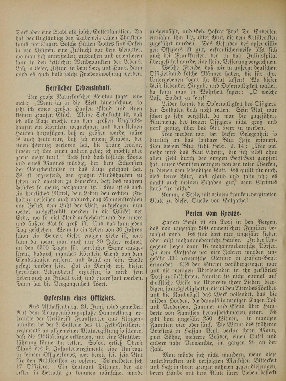 Hassan Beyli ist ein Dorf in den Bergen, das von ungefähr 500 armenischen Familien be— wohnt wird. Es sind dort nur ungefähr sieben oder acht mohammedanische Häuser. In der Um- gegend liegen dann 16 mohammedanische Dörfer. In dem Massakre vor vier Jahren wurden un— gefähr 330 armenische Männer in Hassan-Beyli ermordet. Als der Sturm vorübergezogen war und die wenigen Überlebenden in ihr zerstörtes Dorf zurückkehrten, konnten sie nicht einmal auf christliche Weise die Überreste ihrer Lieben beer⸗ digen, so ausgiebig hatten die wilden Tiere des Waldes und die Raubvögel das Werk vollendet, das die wilden Horden, die damals in wenigen Tagen Tod und Verderben, Jammer und Elend über Hun— derte von Familien heraufbeschworen, getan. Es gibt dort ungefähr 250 Witwen, in manchen Familien vier oder fünf. Die Witwe des früheren Priesters in Hassan Beyli verlor ihren Mann, zwei Söhne, mehrere Brüder, einen Onkel und Zall. nahe Verwandte, im ganzen 28 an der