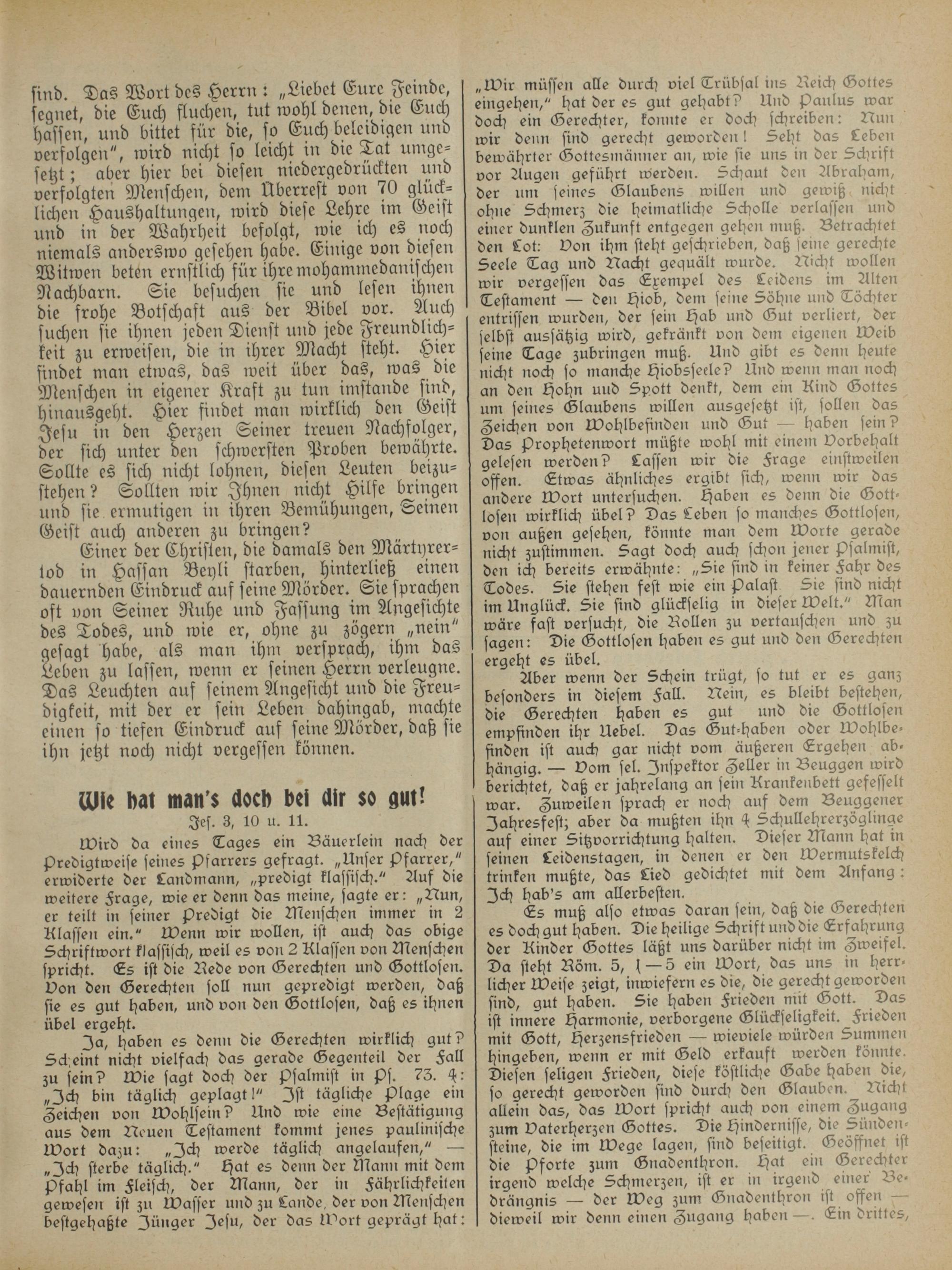 Aber wenn der Schein trügt, so tut er es ganz besonders in diesem Fall. Nein, es bleibt bestehen, die Gerechten haben es gut und die Gottlosen empfinden ihr Uebel. Das Gut-haben oder Wohlbe— finden ist auch gar nicht vom äußeren Ergehen ab⸗ hängig.— Vom sel. Inspektor Seller in Beuggen wird berichtet, daß er jahrelang an sein Krankenbett gefesselt war. Suweilen sprach er noch auf dem Beuggener Jahresfest; aber da mußten ihn 4 Schullehrerzöglinge auf einer Sitzvorrichtung halten. Dieser Mann hat in seinen Leidenstagen, in denen er den Wermutskelch trinken mußte, das Lied gedichtet mit dem Anfang: Ich hab's am allerbesten.
