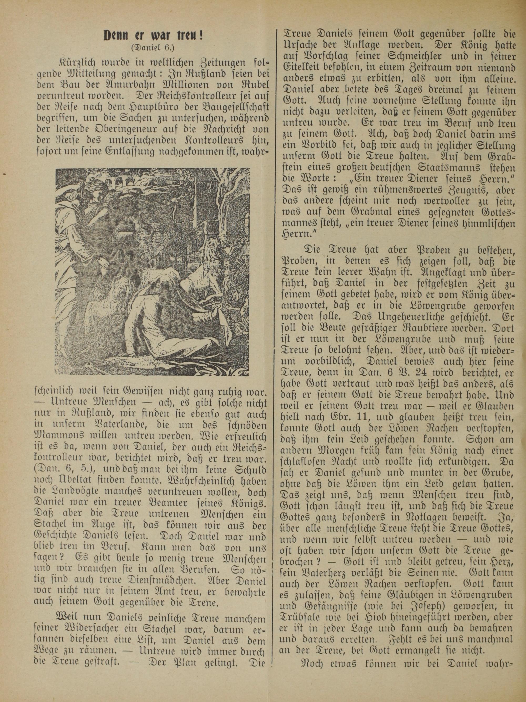 scheinlich weil sein Gewissen nicht ganz ruhig war. — Untreue Menschen— ach, es gibt solche nicht nur in Rußland, wir finden sie ebenso gut auch in unserm Vaterlande, die um des schnöden Mammons willen untreu werden. Wie erfreulich ist es da, wenn von Daniel, der auch ein Reichs— kontrolleur war, berichtet wird, daß er treu war. (Dan. 6, 5.), und daß man bei ihm keine Schuld noch Übeltat finden konnte. Wahrscheinlich haben die Landvögte manches veruntreuen wollen, doch Daniel war ein treuer Beamter seines Königs. Daß aber die Treue untreuen Menschen ein Stachel im Auge ist, das können wir aus der Geschichte Daniels lesen. Doch Daniel war und blieb treu im Beruf. Kann man das von uns sagen? Es gibt heute so wenig treue Menschen und wir brauchen sie in allen Berufen. So nö— tig sind auch treue Dienstmädchen. Aber Daniel war nicht nur in seinem Amt treu, er bewahrte auch seinem Gott gegenüber die Trene.