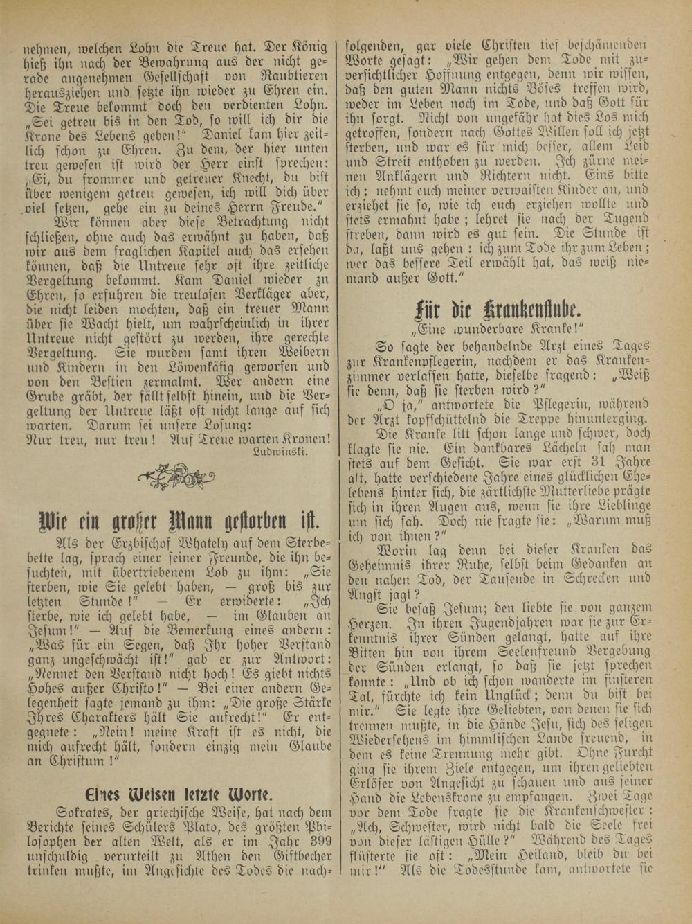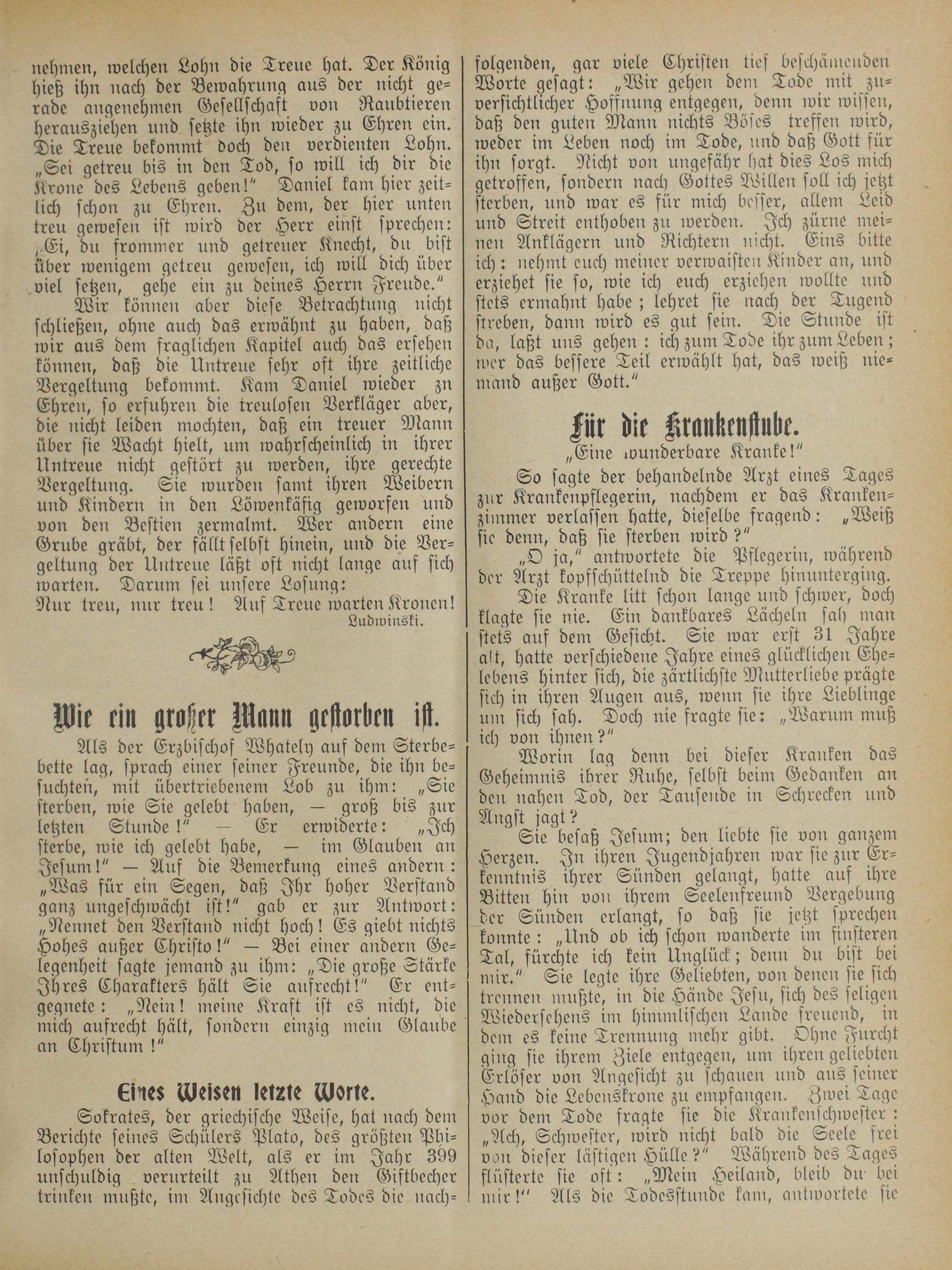 Wir können aber diese Betrachtung nicht schließen, ohne auch das erwähnt zu haben, daß wir aus dem fraglichen Kapitel auch das ersehen können, daß die Untreue sehr oft ihre zeitliche Vergeltung bekommt. Kam Daniel wieder zu Ehren, so erfuhren die treulosen Verkläger aber, die nicht leiden mochten, daß ein treuer Mann über sie Wacht hielt, um wahrscheinlich in ihrer Untreue nicht gestört zu werden, ihre gerechte Vergeltung. Sie wurden samt ihren Weibern und Kindern in den Löwenkäfig geworfen und von den Bestien zermalmt. Wer andern eine Grube gräbt, der fällt selbst hinein, und die Ver— geltung der Untreue läßt oft nicht lange auf sich warten. Darum sei unsere Losung: